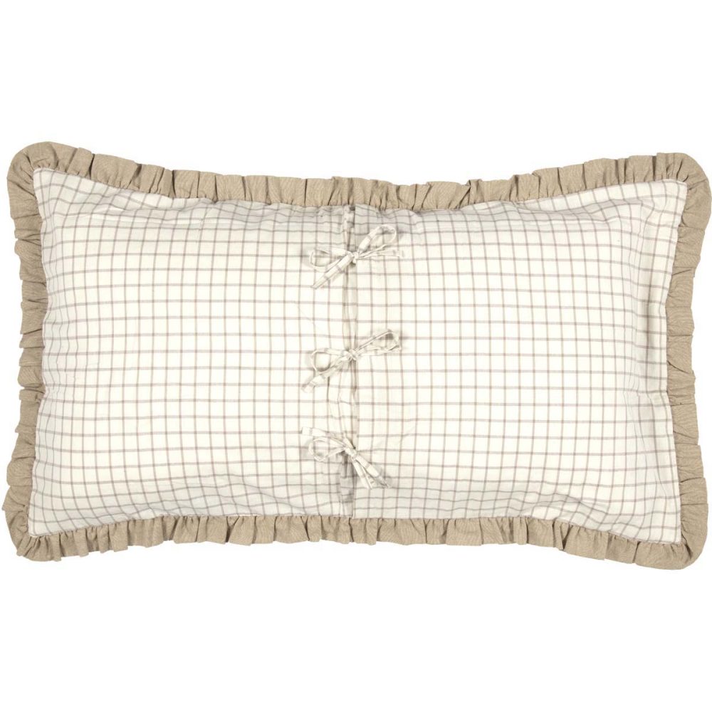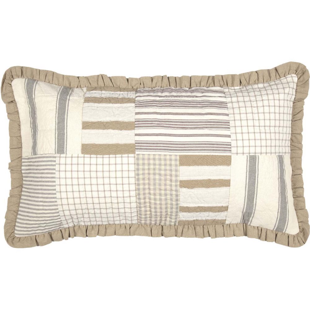 Soft grain sack style fabrics and a comfortable burlap ruffle create just the finishing touch you need for the coziest place in your home. The Grace King Sham 21x37 is carefully crafted with patchwork detailing featuring high-quality stitching and timeless fabrics for an heirloom quality look and feel. Quilted fabric blocks include an array of muted stripes and checks in creme, natural tan and nickel grey for a vintage farmhouse look. Crafted in 100% cotton with a romantic cotton burlap ruffled border. Backed with a tan and white windowpane checked fabric with tie-style closures. Coordinates wonderfully with the Grace Collection from VHC for a complete look.