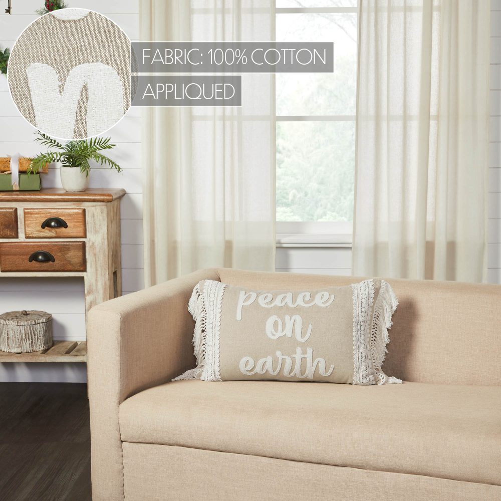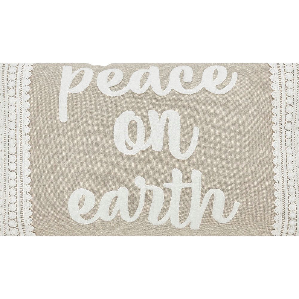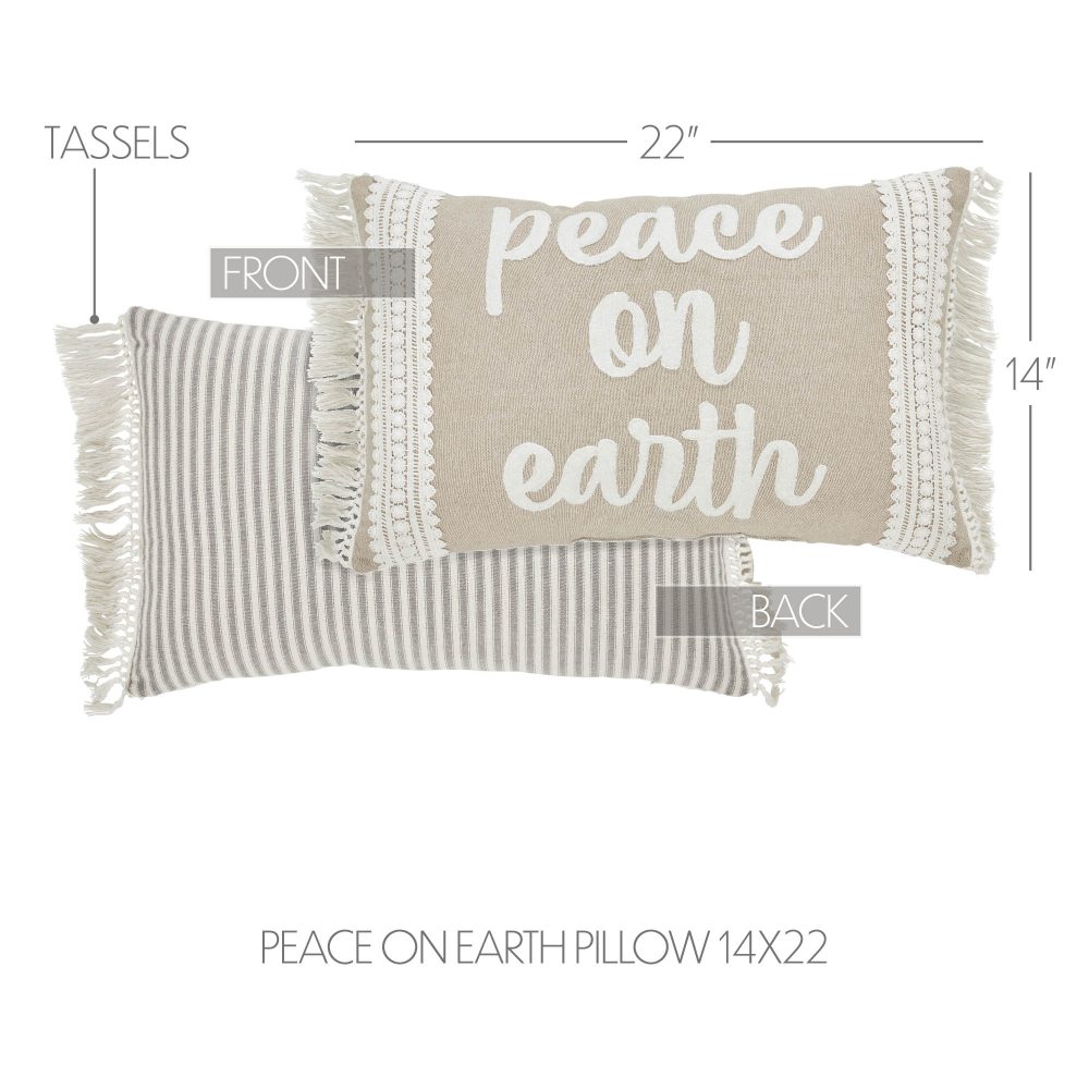 Add a neutral and charming pop of festive style with this Christmas accent pillow. The Grace Peace on Earth Pillow measures 14 by 22 inches. The filled pillow features a deep tan fabric with word art reading, Peace on Earth and simple creme lace accents for a charming farmhouse look with seasonal flair. Long tassels in soft creme add interest and country boho style. The cozy home accessory reverses to a classic ticking stripe fabric for casual farmhouse style. Spot clean as needed. Coordinates with the Grace Collection by VHC for modern farmhouse style for your whole home.