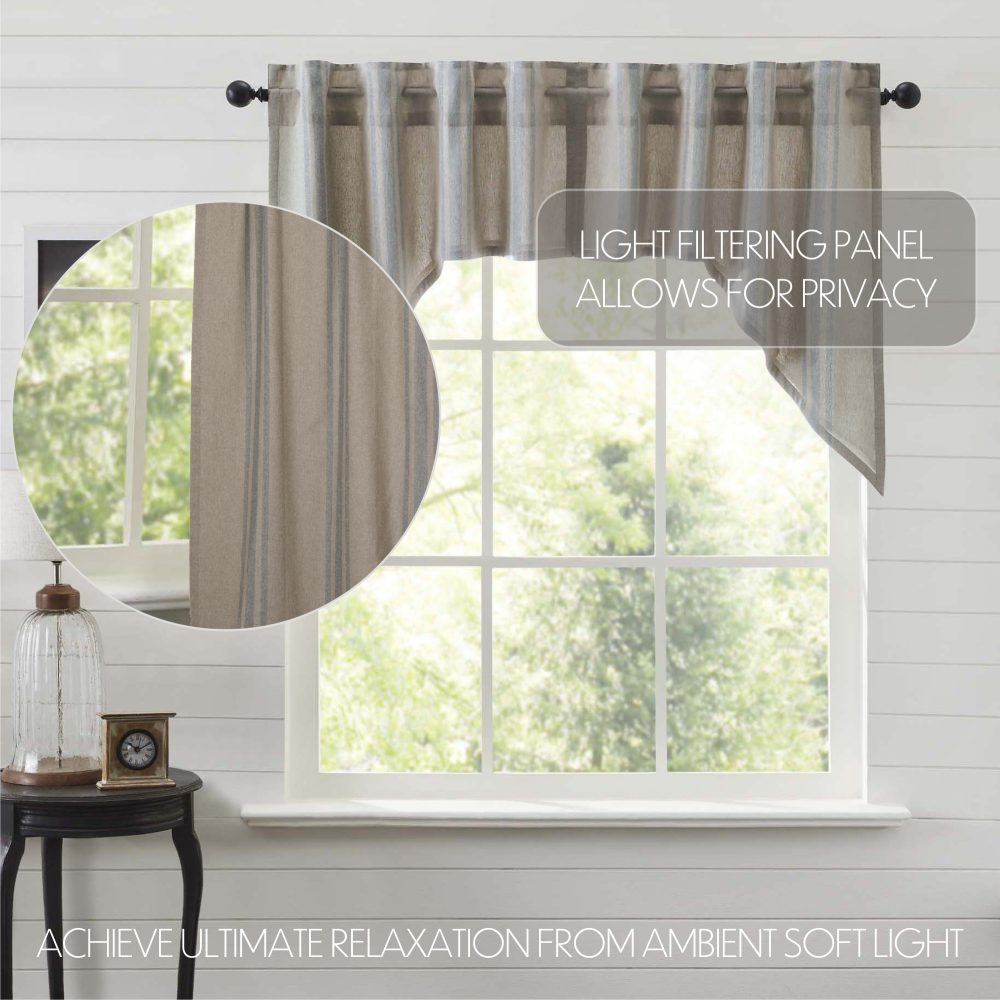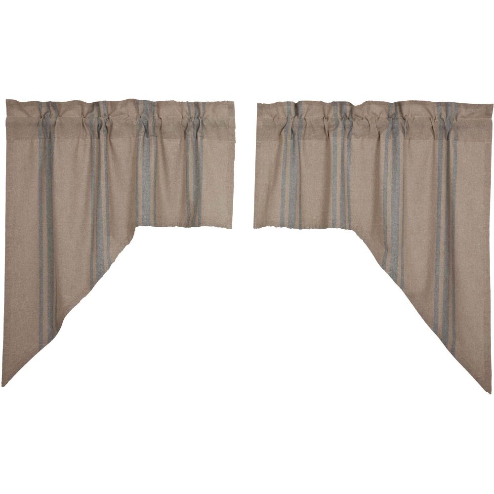 The Grain Sack Blue Swag Set adds charming, country style to your home. Swag curtains are a classic country style featuring angled drapes to frame your window while leaving space open for additional natural light. Our curtains feature a grain sack fabric in striped khaki and grey-blue for farmhouse charm. Includes a rod pocket and loops for easy hanging.