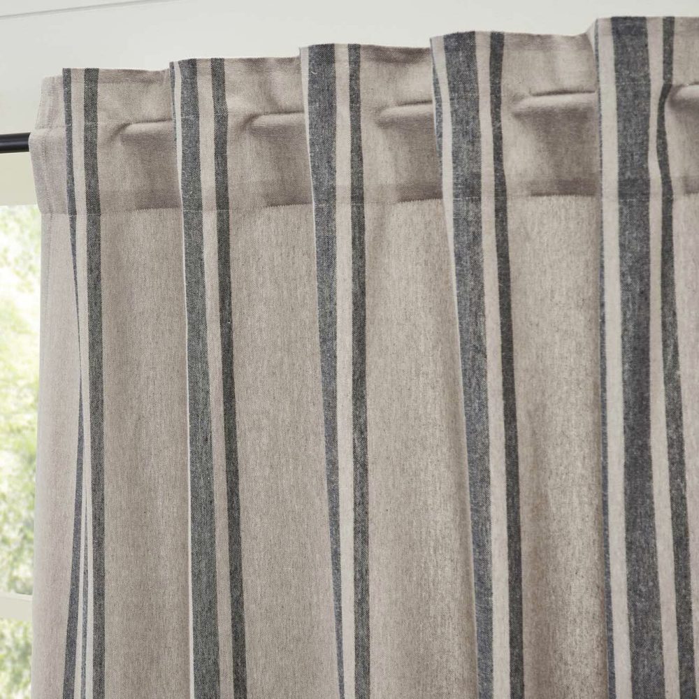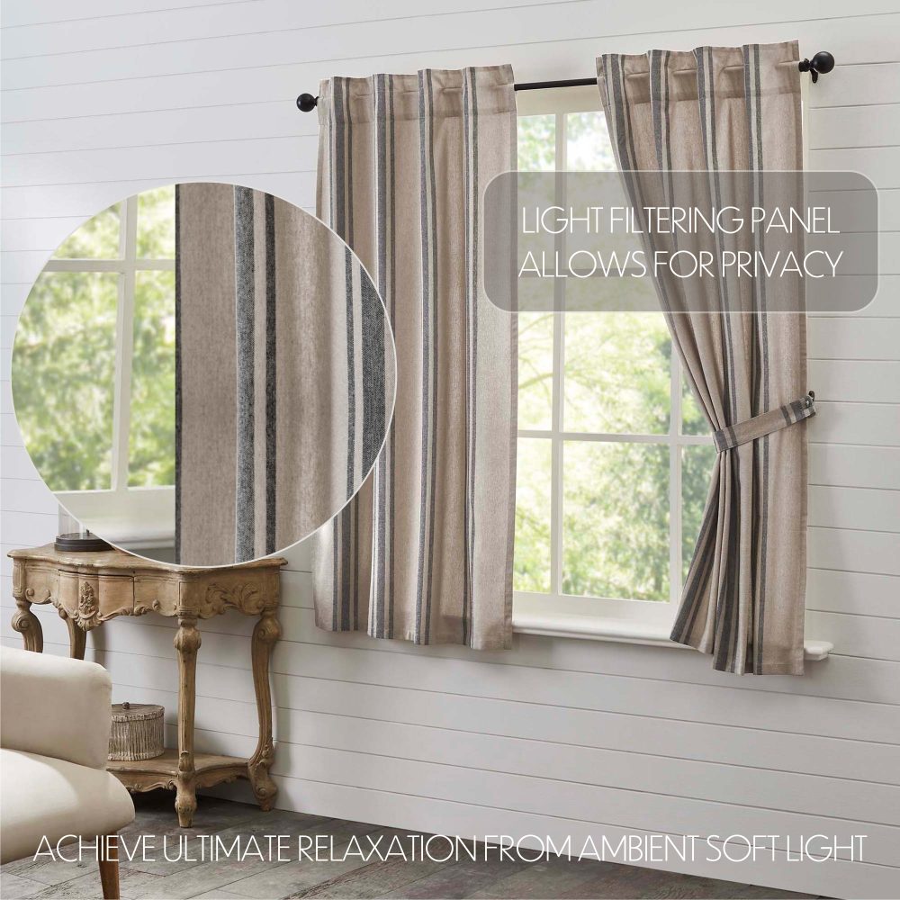 - VINTAGE FARMHOUSE CURTAIN: Two 63 x 36 inch short country window panels made of high-quality chambray fabric in a khaki and charcoal grey striped pattern. Includes matching tie backs.