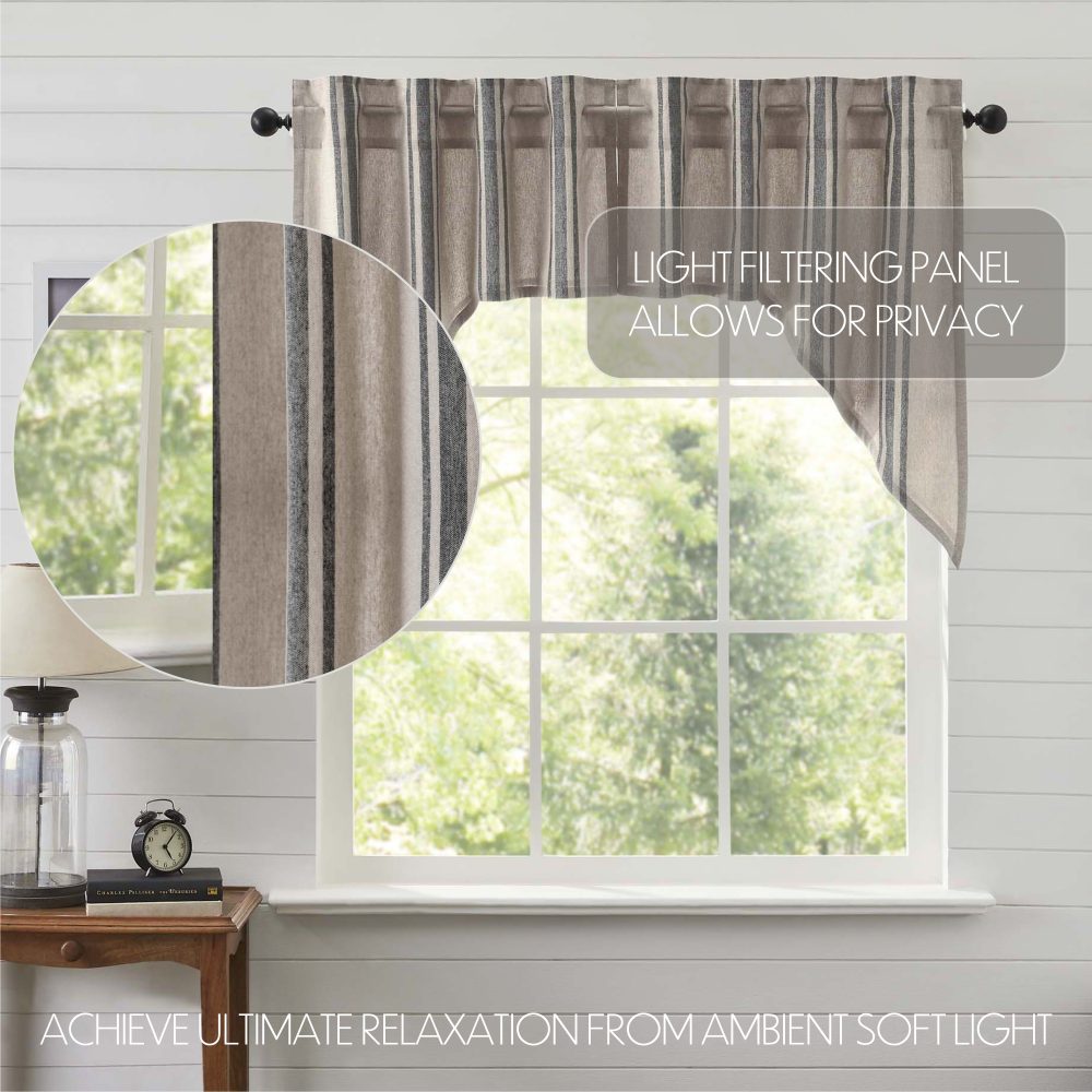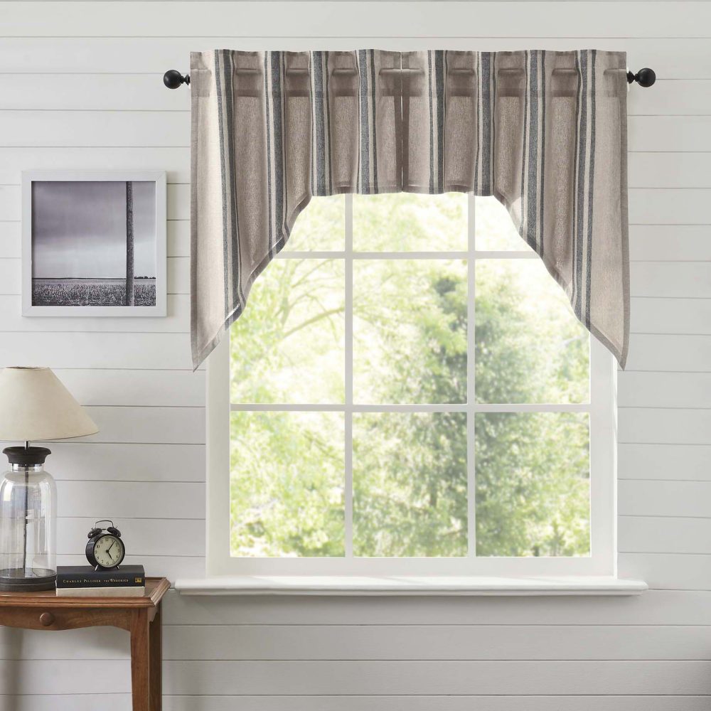 The Grain Sack Charcoal Swag Set adds charming, country style to your home. Swag curtains are a classic country style featuring angled drapes to frame your window while leaving space open for additional natural light. Our curtains feature a grain sack fabric in striped khaki and charcoal black for farmhouse charm. Includes a rod pocket and loops for easy hanging.