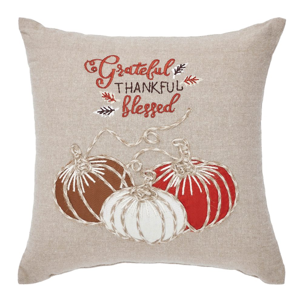 - EXQUISITE FARMHOUSE DESIGN & QUALITY: Infuse your home with autumn warmth using this 12×12-inch square decorative pillow, expertly constructed from a soft yet durable cotton and polyester blend, showcasing precise “Grateful, Thankful, Blessed” embroidery set amongst a trio of charming pumpkins rendered in a comforting palette of taupe grey, sun-warmed pumpkin orange, and rich chocolate brown, providing a versatile accent for any space from living rooms to entryways, and designed for easy spot-clean care.