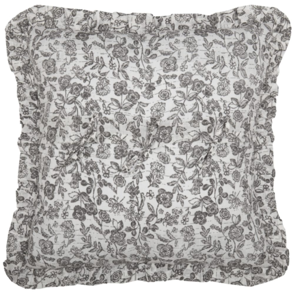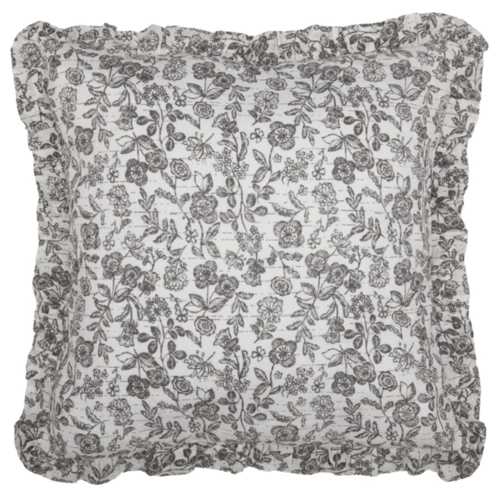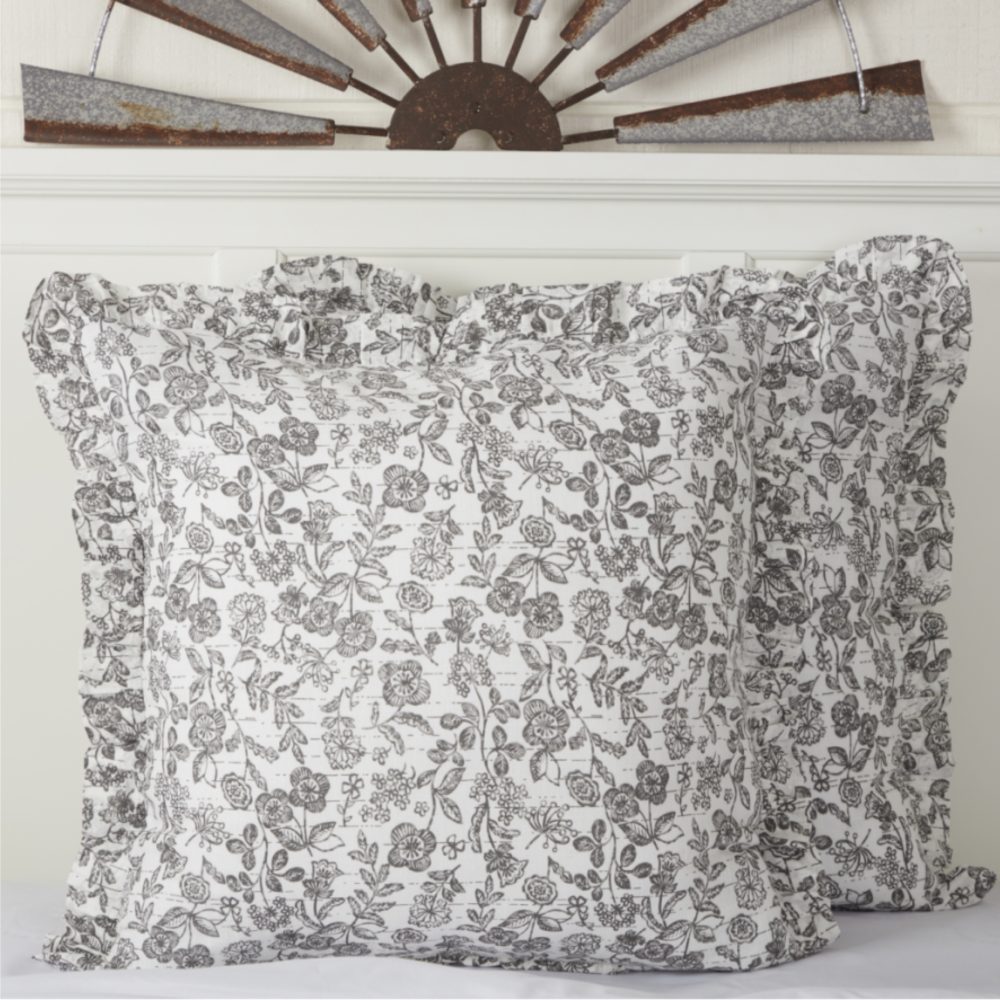 You're going to love how easy it is to transform your farmhouse bedroom with the fresh, fun fabric of the Gray Gables Floral Euro Sham. The dynamic design of delicate flowers offers an airy look that has visual energy and appealing movement. The quiet grays and soft restful white add an understated color palette that never looks overdone, keeping the focus on crisp, floral details and sweet feminine flair. A ruffle surrounds the cover on all sides, adding a luxurious layer of texture and softness. The sham reverses to the same fabric with three matching ties to keep pillow in place. Other linens in the Gray Gables Collection are designed to blend effortlessly with the shams, allowing you to mix and match them, creating a look that is as distinct and individual as you are!!