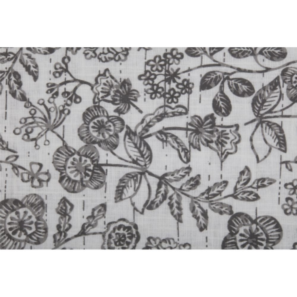 - 100% cotton, lightweight, off white, cotton-slub fabric, printed with a botanical floral in shades of charcoal and soft gray. Fabric has a linen-like appearance.