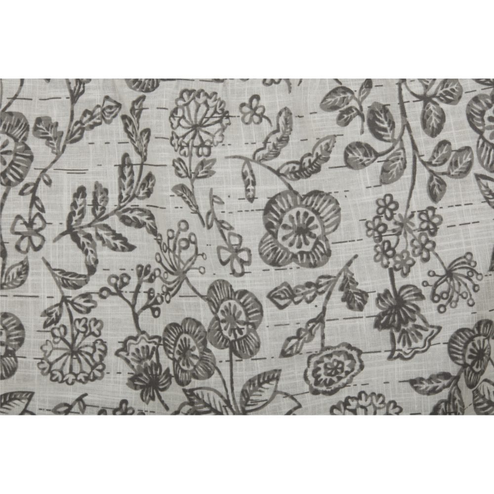 - 100% cotton, lightweight, off white, cotton-slub fabric, printed with a botanical floral in shades of charcoal and soft gray. Fabric has a linen-like appearance.