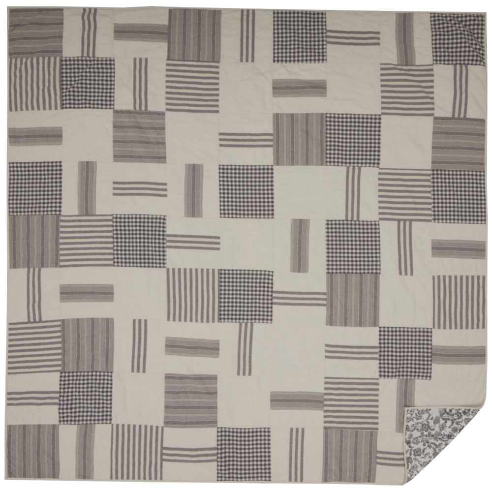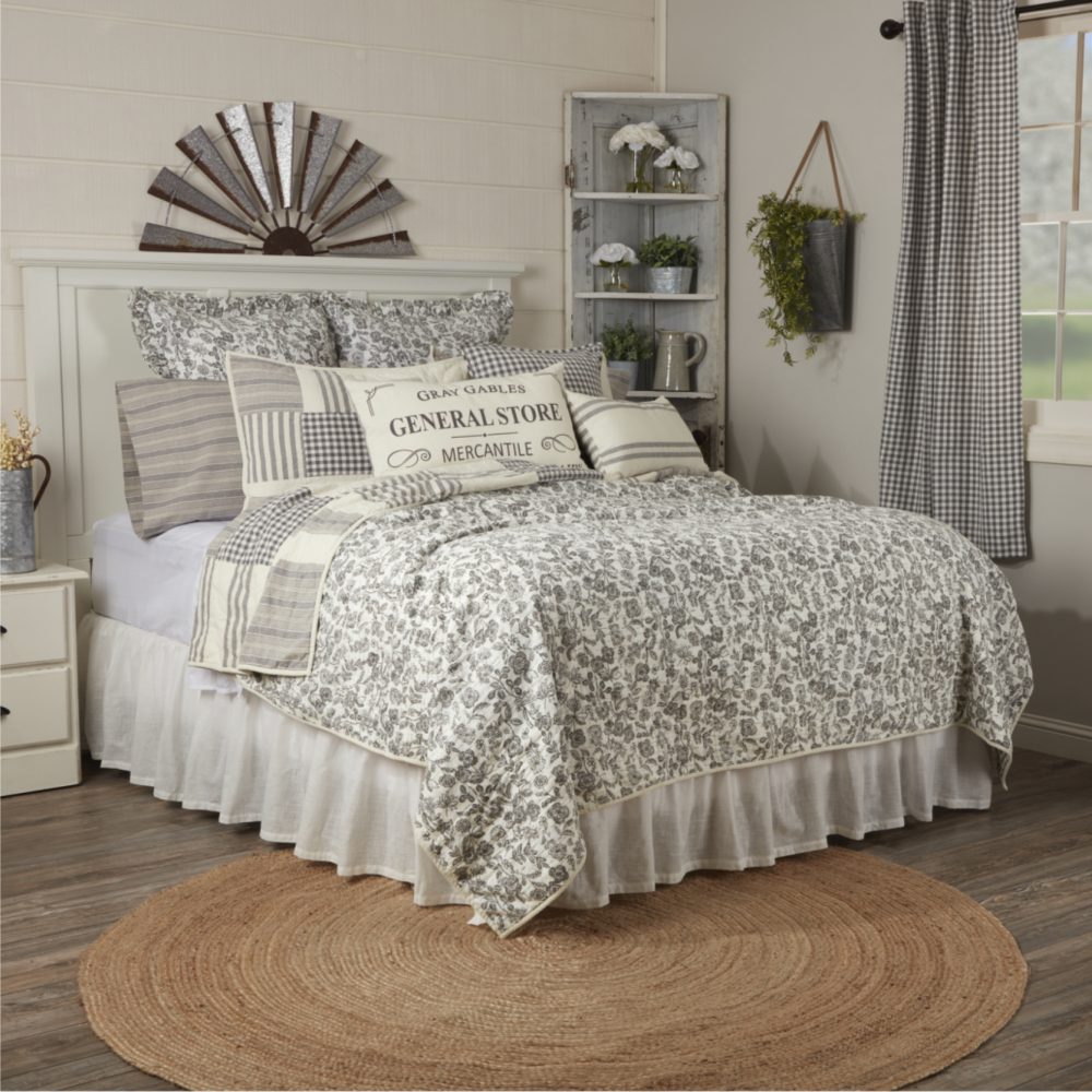 Salute a Time-Honored Aesthetic. Experience an era when cozy textures and unique patterns meant nothing went to waste. Gray Gables Patchwork Quilts with reversible floral-print sides add artful elements to your farmhouse bedroom decor. Distinguished by big blocks of gingham checks and grain-sack ticking stripes, our farmhouse quilt bedding pays homage to our grandparents who infused their home with the right mix of hard-working practicality and graceful femininity. Now we offer you a collection of timeless pieces that meld seamlessly to create 1-of-a-kind country decor. Little Things Mean a Lot Our gorgeous patchwork and floral gray quilt bedspreads are imbued with heirloom-quality craftsmanship. Ten-inch blocks are finished with stitch-in-the-ditch and echo hand-quilting and machine-pieced with a vibrant blue floral design on the other side. These fabrics work beautifully together, complimenting each other in the same ways that our grandparents did.