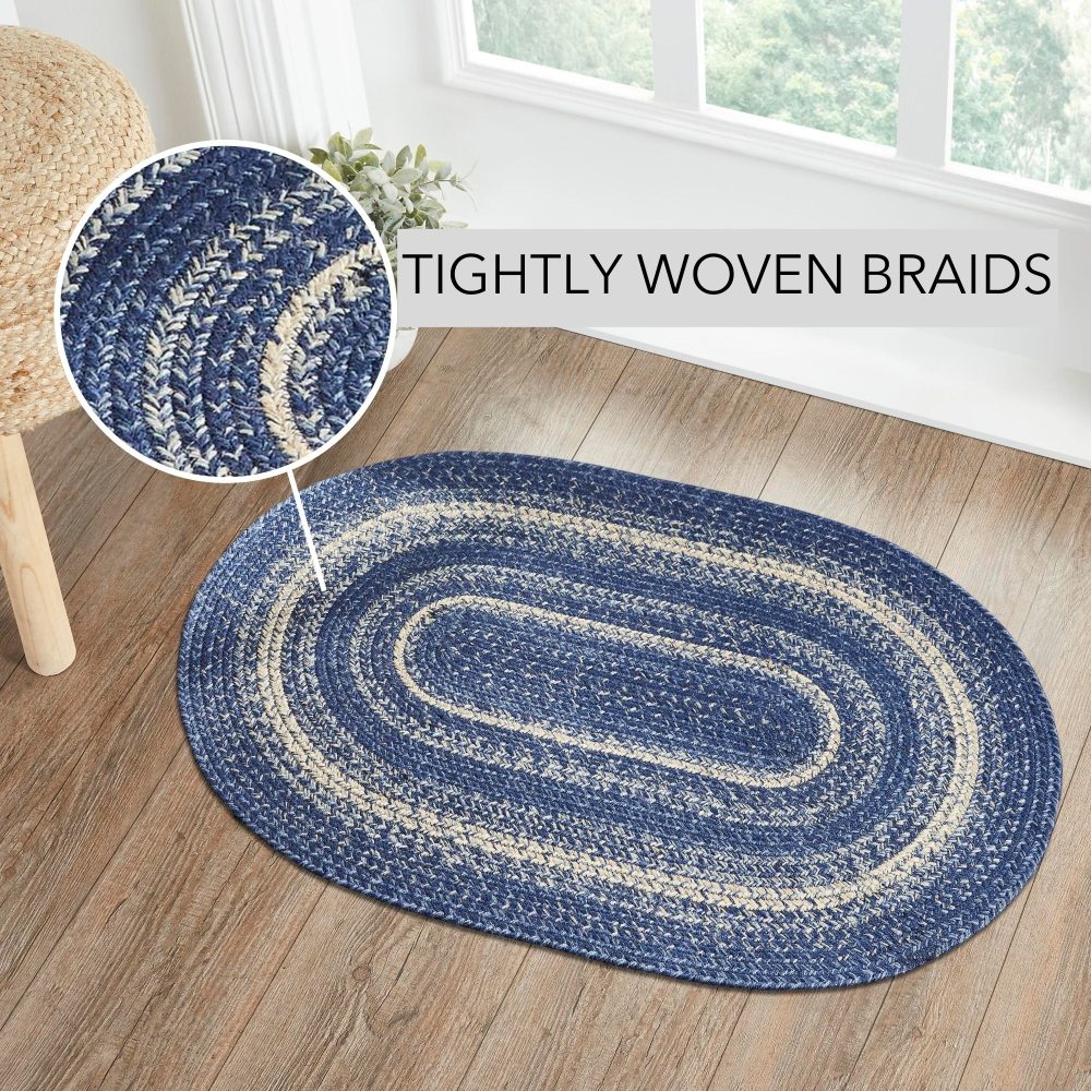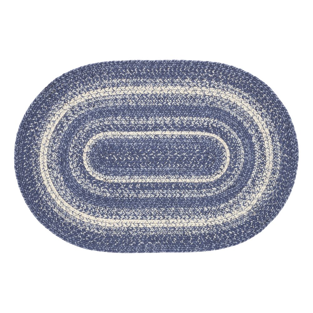 Create a stylish, modern feel with timeless shades of blue and creme in a curl-resistant jute blend that adds style and safety anywhere a mid-size accent rug is needed. The Great Falls Jute Rug measures 24x36 inches and features a classic oval shape and tight braids constructed with a durable jute blend. The special blend relaxes faster and stays flat. Features a blend of indigo, powder blue and creme for a bright, classic look that complements a wide array of country farmhouse and coastal cottage decor.