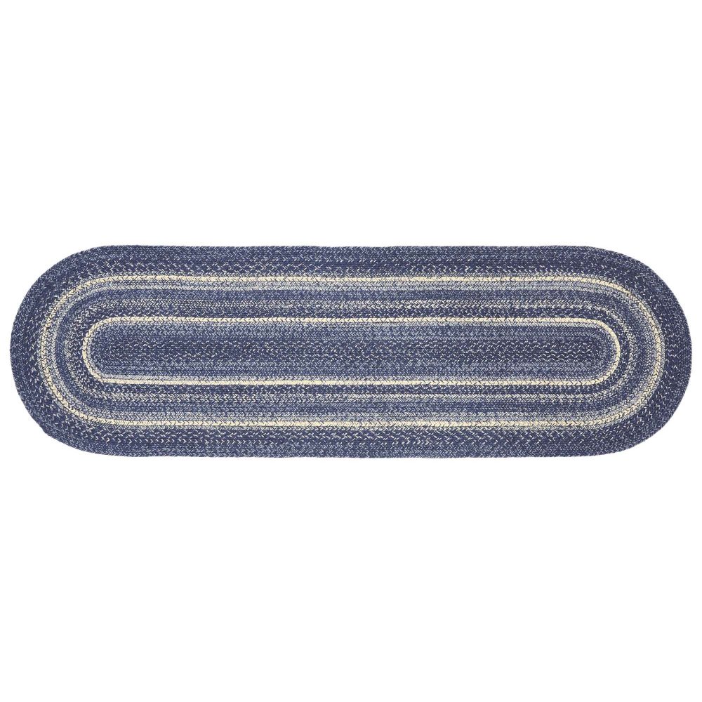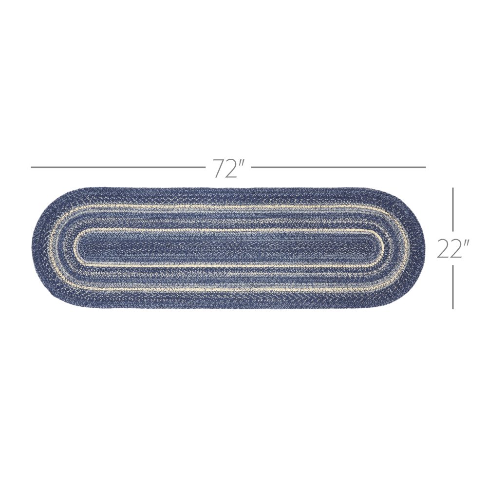 Create a warm, homey feeling with deep primitive colors in a curl-resistant jute blend that adds style and safety anywhere a long runner style rug is needed. The Great Falls Jute Rug measures 22x72 inches and features a classic oval shape and tight braids constructed with a durable jute blend. The special blend relaxes faster and stays flat. The included PVC mat makes sure your beautifully braided jute rug stays exactly where it should. Features a blend of indigo, powder blue and creme for a bright, classic look that complements a wide array of country farmhouse and coastal cottage decor.