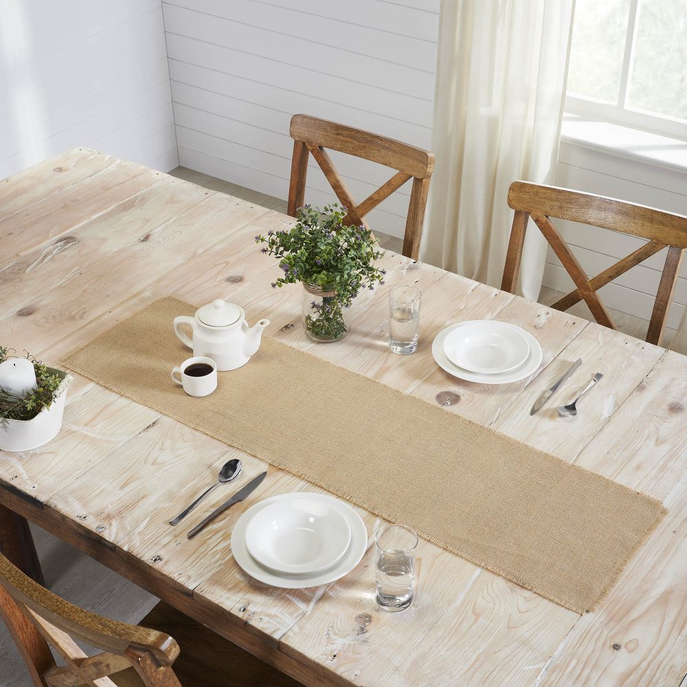 Neutral texture sets the stage for a joyful holiday table with the Greetings Jute Burlap Tan Runner. The simple, neutral table runner measures 12x48 inches and is constructed with unbleached, natural tan jute. The burlap table runner features frayed edging for a rustic look and feel. Dress up this cozy, texture-rich design with your favorite festive plates or serving dishes for a complete country Christmas table.