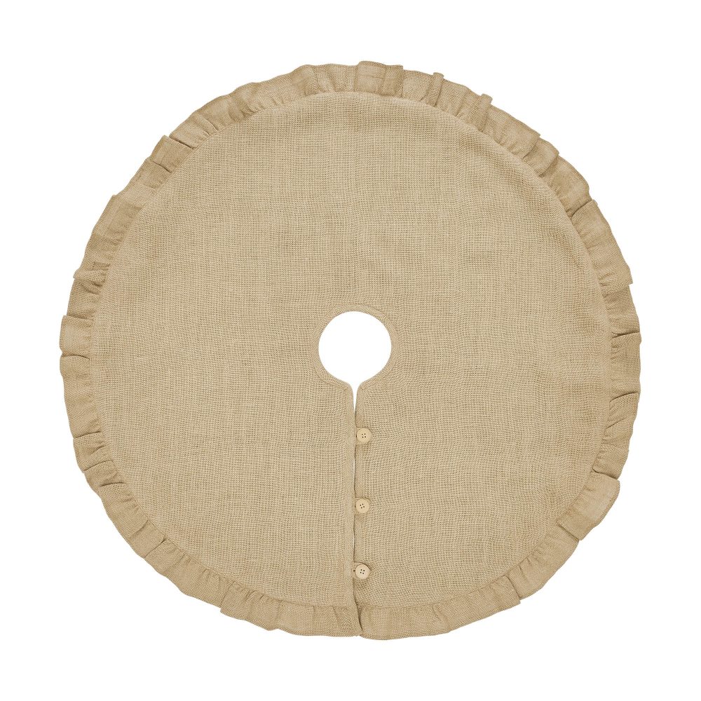 Add timeless style to your Christmas traditions with the Greetings Jute Burlap Tree Skirt. The round tree skirt features a 36 inch diameter. A warm tan jute burlap base includes a delicate ruffled edge to add simple, sophisticated style for a perfect farmhouse Christmas look. The elegant Christmas tree skirt includes button-style closures. Pair with matching stockings for a complete, festive holiday look.