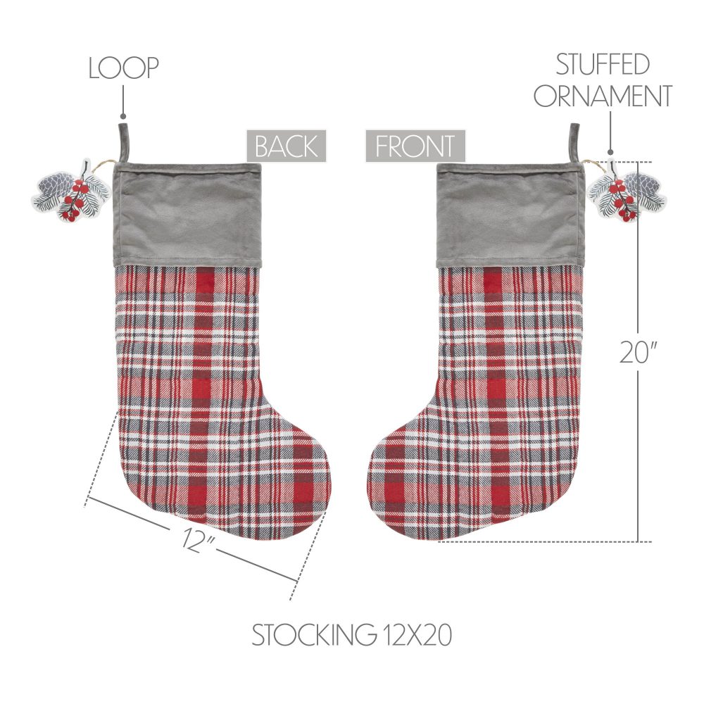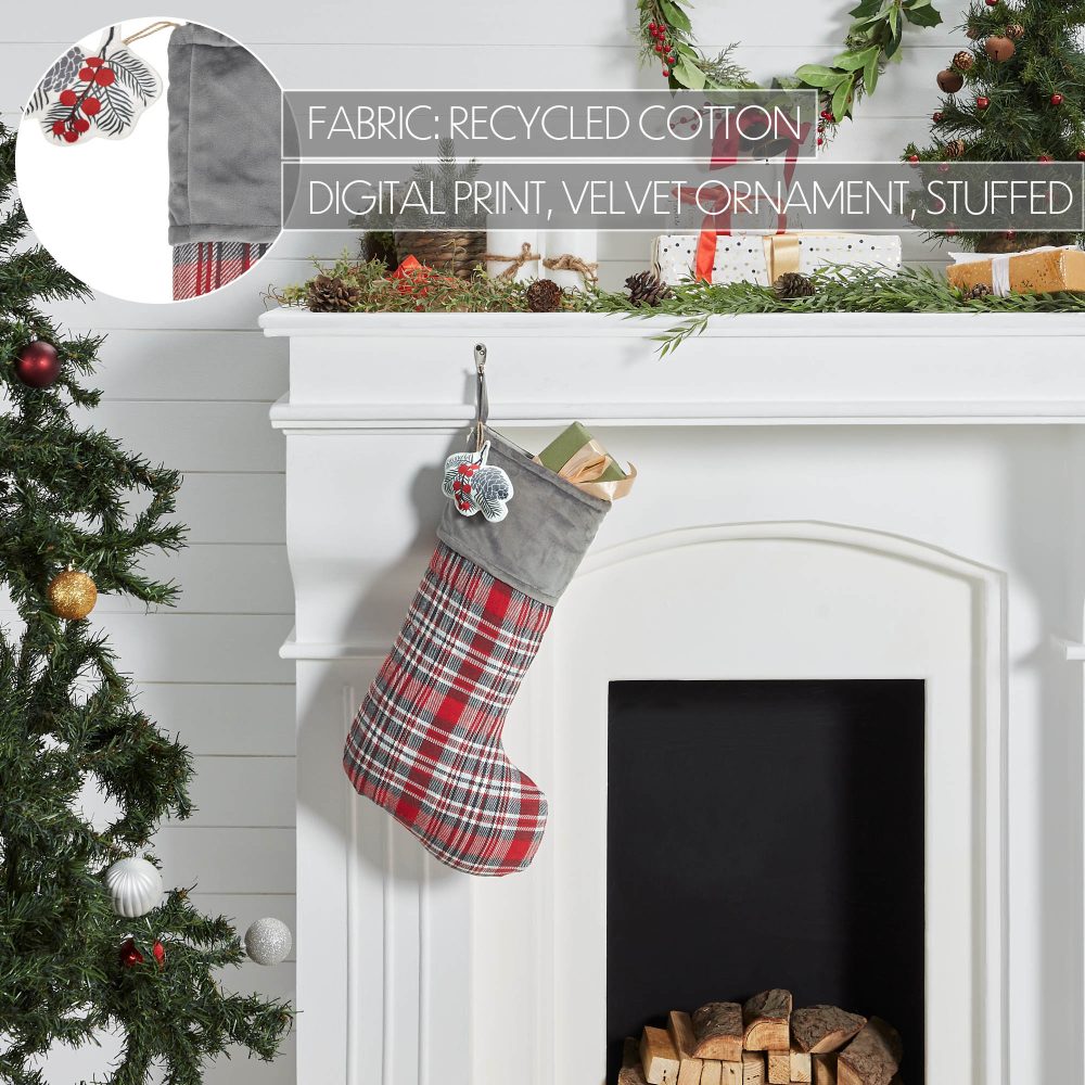 Nothing sets the tone for your holiday decorations quite like your choice of a Christmas stocking. Craft a perfectly timeless style for your home with the Gregor Plaid Stocking. The classic holiday stocking measures 12x20 inches and features a quilted, 100 percent cotton base. A non-quilted cuff in neutral grey adds contrast to the classic red, grey and thyme green tartan plaid body. Includes loop to easily hang by the chimney with care. Coordinates with the Gregor Plaid Collection by VHC Brands for a classic country Christmas look.