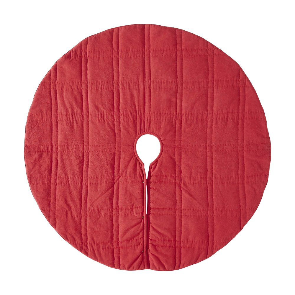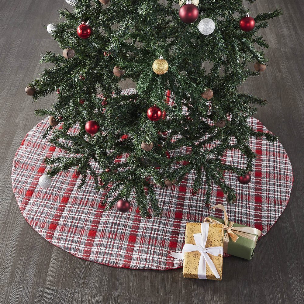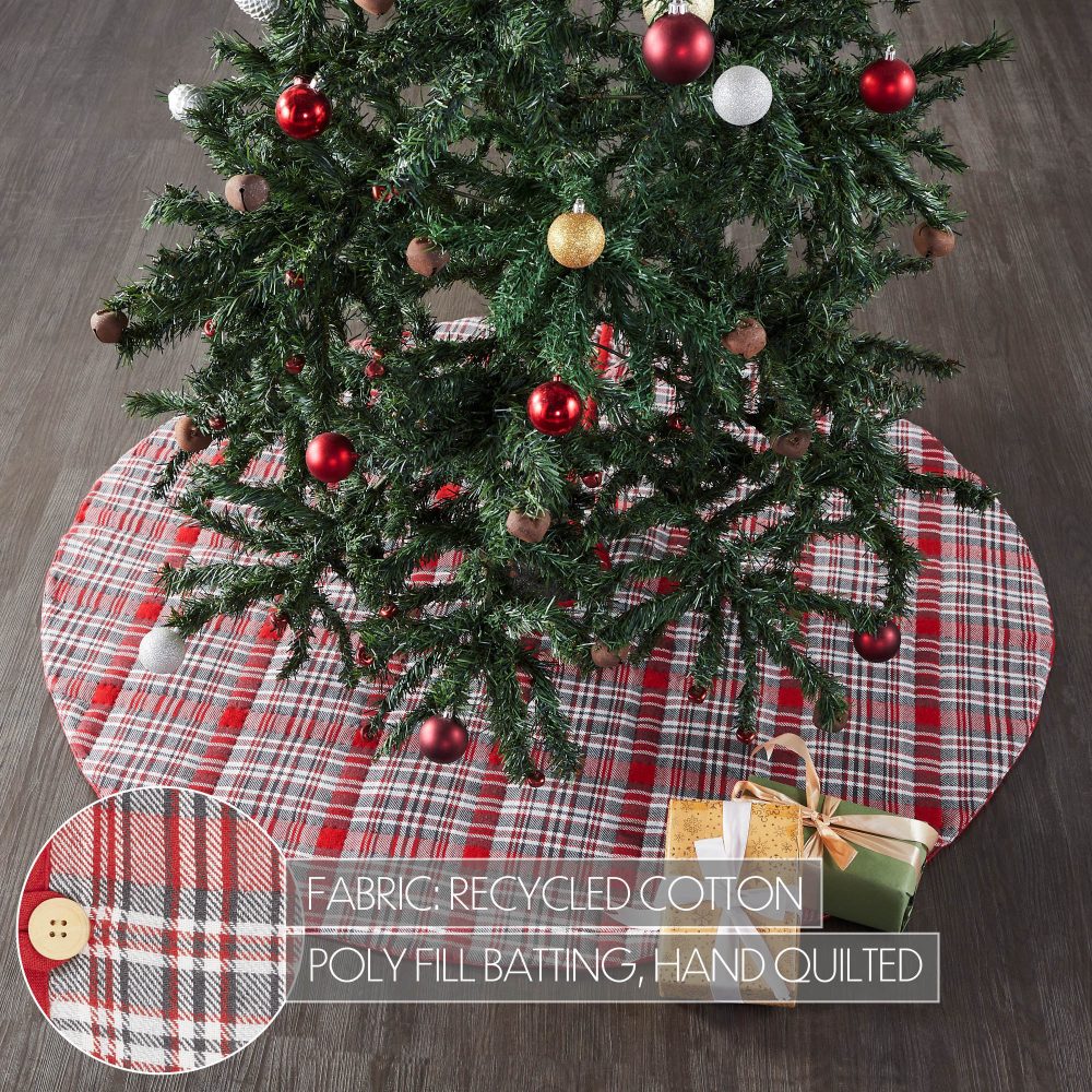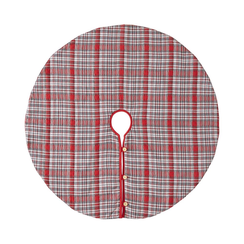 Add rustic style to your Christmas traditions with the Gregor Plaid Tree Skirt. The round tree skirt features a 48 inch diameter. A bright red base with white and grey tartan plaid stripes add country style for a timeless Christmas look. The classic red Christmas tree skirt is made for yearly use with a cotton base and quilted details designed to mimic the plaid striping. Pair with coordinating items from the Gregor Plaid Collection by VHC for a complete, festive holiday look.
