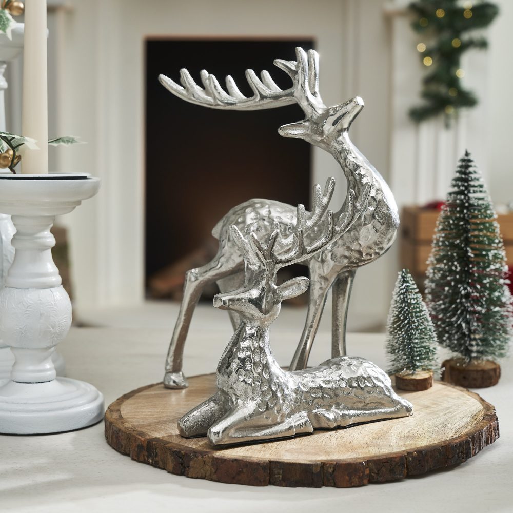 Bring graceful charm and festive elegance to your holiday decor with the VHC Brands Hammered Reindeer Figurines Set of 2. This beautifully coordinated pair features one reindeer standing tall with its head raised and the other resting peacefully, creating a dynamic and balanced visual display. Both figures are crafted from sturdy metal and finished in bright silver with a distinctive hammered texture that adds rustic depth and artisanal appeal. Electroplated for a polished shine, these reindeer figurines offer a perfect blend of primitive style and modern sparkle. Their sculptural design makes them ideal as a tabletop centerpiece, mantle accent, or decorative addition to a holiday shelf or entryway table. The contrast between the standing and resting poses creates visual interest and conveys a peaceful, wintry elegance. These solid-color figurines are suited for placement in any room of your home-whether it's the bathroom, bedroom, dining room, entry, kitchen, or living room. Their timeless design and durable craftsmanship make them a seasonal favorite for years to come. To maintain their lustrous finish, simply wipe clean with a soft cloth.