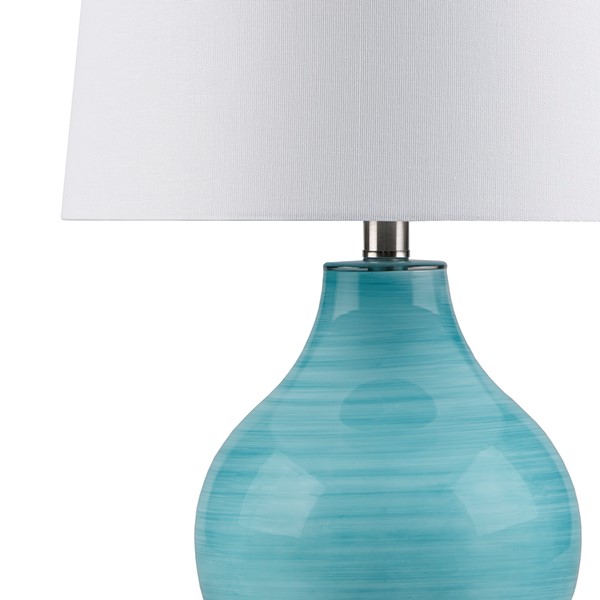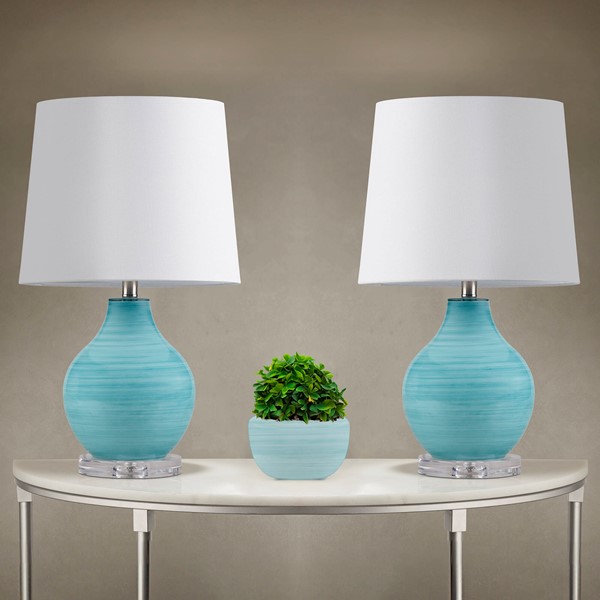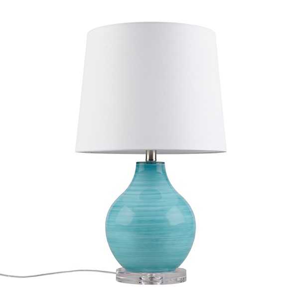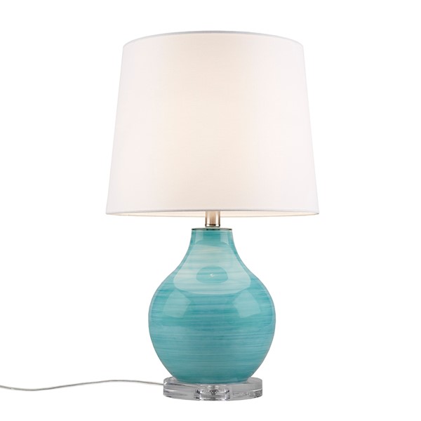 Transform your space with the Maelle Glass Table Lamp by 510 Design – where artistry meets functionality. Crafted from stunning blue aqua swirl blown glass, it sits elegantly on an acrylic base. Topped with a white tapered drum shade boasting a clear finial, it adds modern elegance. The On/Off rotary switch and a 60" clear cord offer convenience. Accommodates Type A bulbs and one 9W LED bulb included; not dimmable. Spot clean and avoid abrasive cleaners. Enjoy a 2-year limited warranty. Elevate your space with the Maelle lamp – a perfect blend of style and durability.