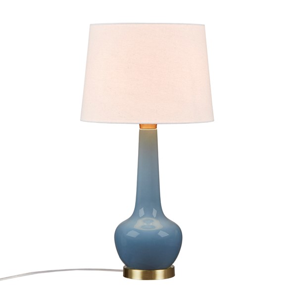 Radiate charm with the 510 Design Zazie Table Lamp. Its genie-style design, blending a refined ceramic base and a gold metal accent, embodies a seamless transitional style. The cream tapered drum shade emits a warm glow, adding sophistication and versatility. Featuring an on/off switch and a 60" cord, this plug-in lamp comes with a 9W LED bulb for instant ambiance. Its low-maintenance design ensures enduring elegance–a perfect addition for timeless allure in any space.