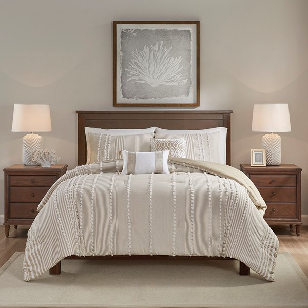 Update your bedroom with the casual beauty of the Harbor House Anslee Cotton Yarn Dyed 3 Piece Comforter Set. Oversized and overfilled, this cotton yarn dyed comforter showcases stripes of various widths in soft taupe and white hues. Clip Jacquard detailing add alluring texture and dimension and flaunt a chic, farmhouse appeal. A solid taupe reverse complements the top of the bed, while two cotton shams reiterate the design of the comforter for a coordinated look. Made from 100% cotton, this comforter will provide you with the utmost comfort and give you bedroom a refreshing update. This bedding set is also OEKO-TEX certified, meaning it does not contain any harmful substances or chemicals, ensuring quality comfort and wellness. Due to the nature of the chenille fabric, some shedding will occur naturally in the first 3-4 washes. This bedding set may come in rolled or compressed packing and will need to be fluffed up. Use a steam iron to help remove wrinkles easier.