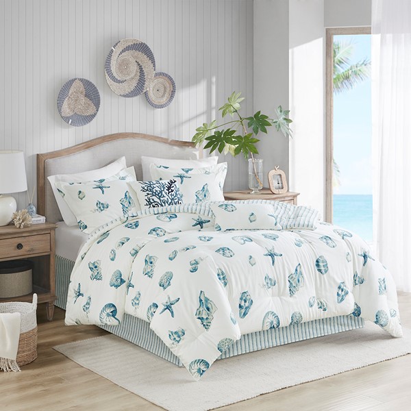 Bring a sense of the sea side into your home with this beautiful, casual Beach House bedding collection from Harbor House. The comforter features a shell pattern that is printed in shades of blue onto a white, cotton brushed twill. Fully reversible, the oversized comforter reverses to a yarn-dyed stripe in blue and white. Completing the set, the bed skirt also follows this striped pattern to pull everything together. The set is machine washable for easy care and includes one comforter, one bed skirt, and two shams (one for Twin size). Top off the look even more with the two decorative pillows, sold separately. This bedding set is also OEKO-TEX certified, meaning it does not contain any harmful substances or chemicals, ensuring quality comfort and wellness. This bedding set may come in rolled or compressed packing and will need to be fluffed up. Use a steam iron to help remove wrinkles easier.