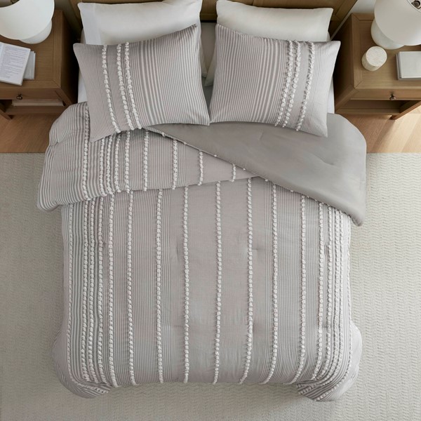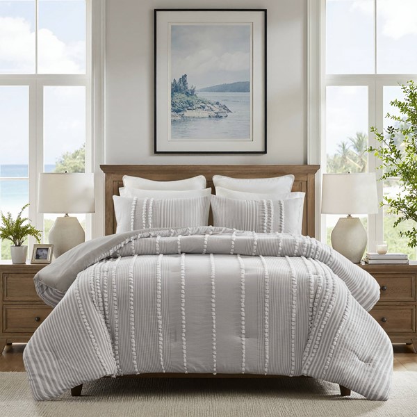 Update your bedroom with the casual beauty of the Harbor House Anslee Cotton Yarn Dyed 3 Piece Comforter Set. Oversized and overfilled, this cotton yarn dyed comforter showcases stripes of various widths in soft taupe and white hues. Clip Jacquard detailing add alluring texture and dimension and flaunt a chic, farmhouse appeal. A solid taupe reverse complements the top of the bed, while two cotton shams reiterate the design of the comforter for a coordinated look. Made from 100% cotton, this comforter will provide you with the utmost comfort and give you bedroom a refreshing update. This bedding set is also OEKO-TEX certified, meaning it does not contain any harmful substances or chemicals, ensuring quality comfort and wellness. Due to the nature of the chenille fabric, some shedding will occur naturally in the first 3-4 washes. This bedding set may come in rolled or compressed packing and will need to be fluffed up. Use a steam iron to help remove wrinkles easier.