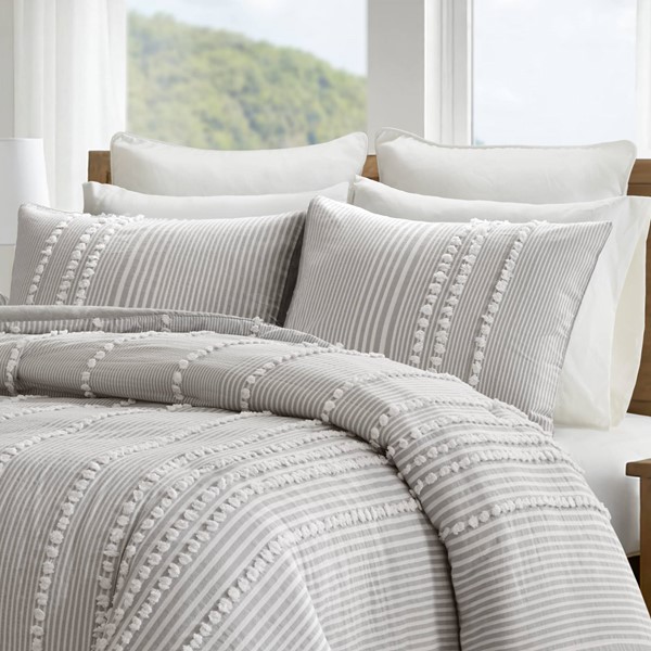Update your bedroom with the casual beauty of the Harbor House Anslee Cotton Yarn Dyed 3 Piece Duvet Cover Set. This cotton yarn dyed duvet cover showcases stripes of various widths in soft taupe and white hues. Clip Jacquard detailing add alluring texture and dimension and flaunt a chic, farmhouse appeal. A solid taupe reverse complements the top of the bed, while two cotton shams reiterate the design of the duvet cover for a coordinated look. Button closures and four inner ties allow you to place and secure a comforter insert (not included) within the duvet cover, for added warmth and comfort. Made from 100% cotton, this duvet cover will provide you with the utmost comfort and give you bedroom a refreshing update. This bedding set is also OEKO-TEX certified, meaning it does not contain any harmful substances or chemicals, ensuring quality comfort and wellness. This bedding set is machine washable for easy care, use a steam iron to help remove wrinkles if needed.