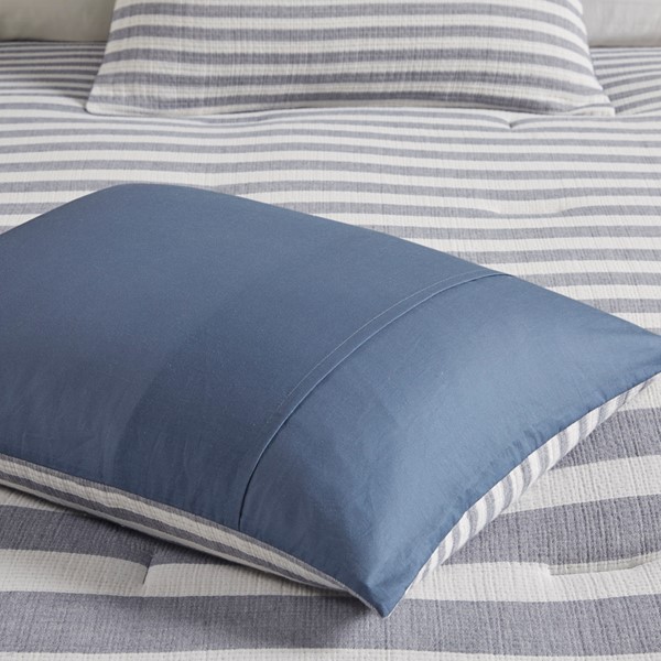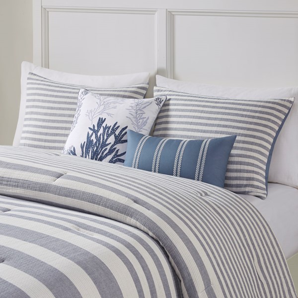 Give your bedroom a refreshing update and relaxing vibe with Harbor House’s Brooks cotton comforter set. Made from 100% cotton, this coastal comforter flaunts textured, horizontal blue and white stripes that create a classic seaside allure. It’s also oversized and overfilled to better spread its cozy comfort across your mattress, especially if your mattress has a high depth. A square pillow and an oblong pillow with embroidered details provide the finishing decorative touches to complete this striped comforter set. This bedding set is also OEKO-TEX certified, meaning it does not contain any harmful substances or chemicals, ensuring quality comfort and wellness.