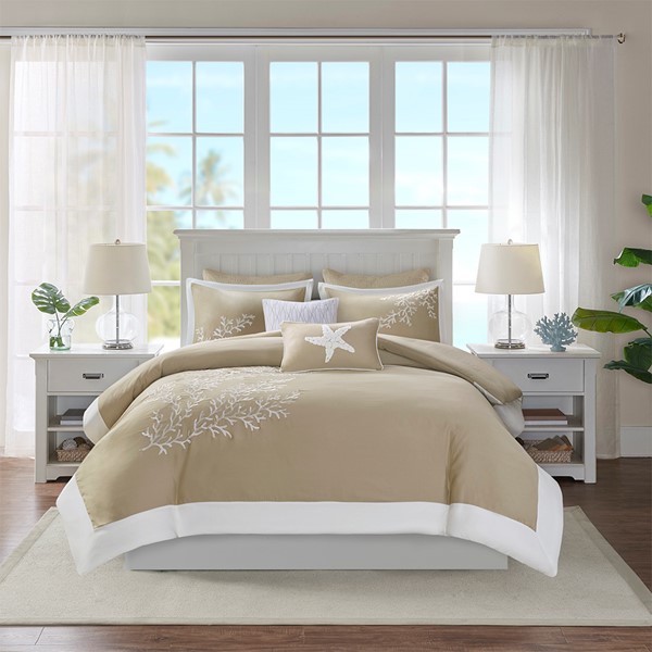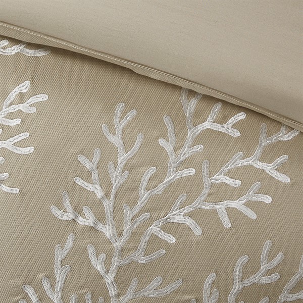 Bring a bit of sea side inspiration into your home with this beautiful bedding collection. The Harbor House Coastline collection features an intricate white coral motif embroidered on a taupe background finished with a pieced white border. Made of 100% cotton jacquard, this 5 piece set includes one duvet cover, two shams, and two decorative pillows. Button closures and four inner ties allow you to place and secure a comforter insert (not included) within the duvet cover, for added warmth and comfort. For best care, dry clean the comforter and shams and spot clean the decorative pillows.