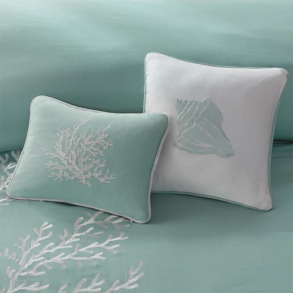 Bring a bit of sea side inspiration into your home with this beautiful bedding collection. The Harbor House Coastline collection features an intricate white coral motif embroidered on an aqua background finished with a pieced white border. Made of 100% cotton jacquard, this 12×16 inch oblong pillow is an accessory to the Coastline bedding collection and features a white embroidered coral on aqua background with white piping.