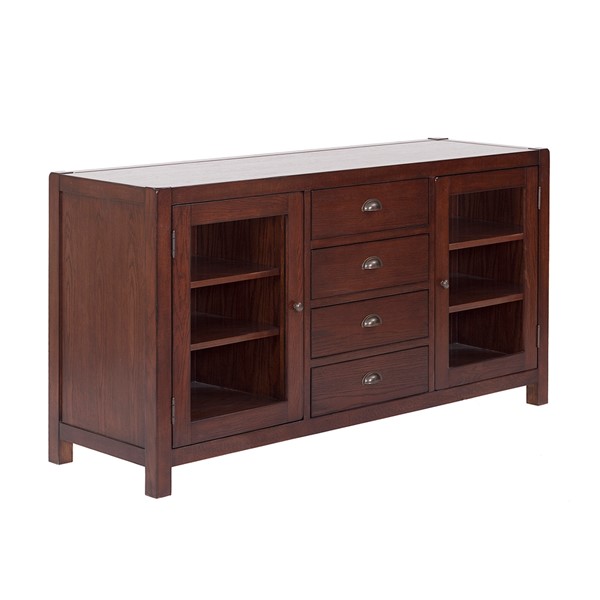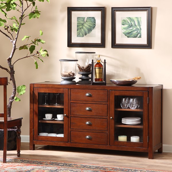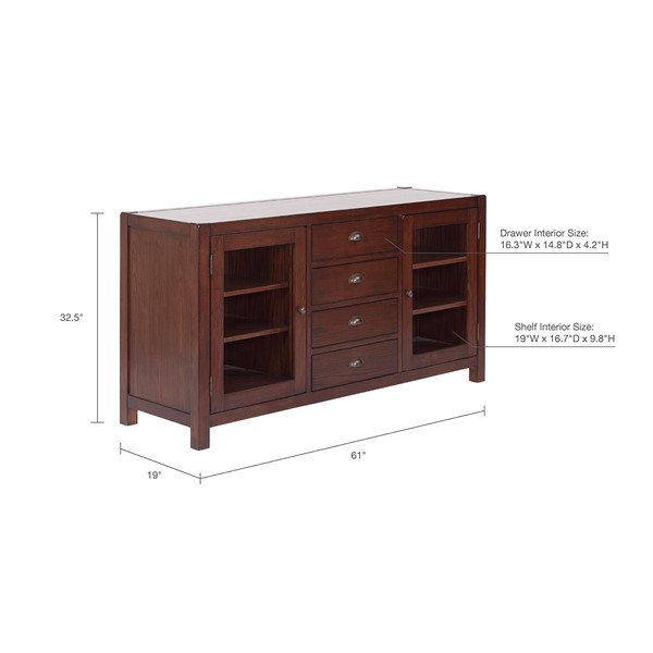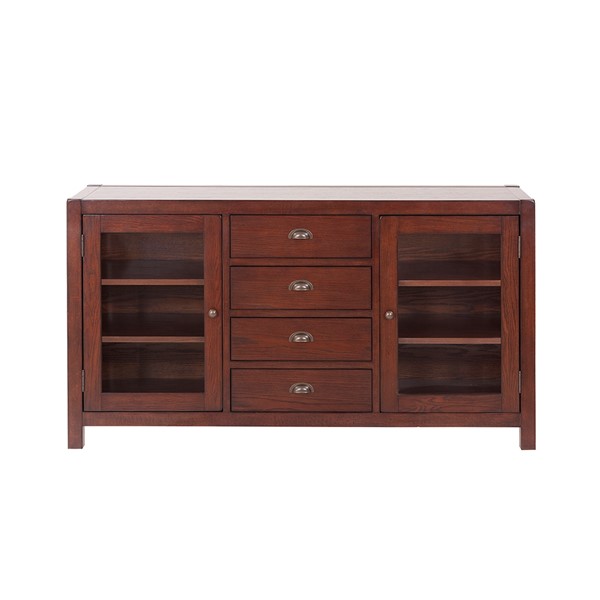 Harbor House’s Harbor Buffet provides a sophisticated and functional update to your home. This wood buffet features two doors with glass panes that open up to two shelves to display your dinnerware or curios. Four drawers offer even more storage space for any other essential items. The espresso wood finish is complemented by the metal accents to create a warm appeal and a refined look. Incorporate this wood buffet in your dining room to give your home a touch of elegance and class. No assembly required. Top weight capacity: 150 lbs. Shelf weight capacity: 75 lbs.