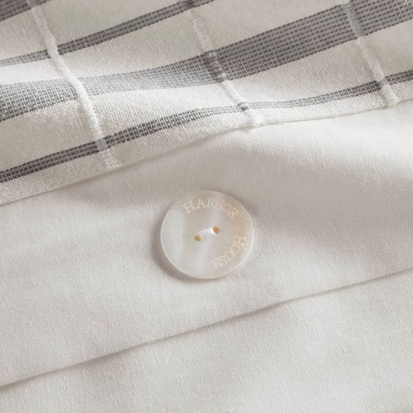Introduce an upscale cottage charm to your bedroom with the Harbor House Morgan 5 Piece Cotton Duvet Cover Set. This 100% cotton jacquard duvet cover features textured vertical woven stripes with contrasting horizontal blue stripes on white ground, for a modest farmhouse look. The duvet cover comes with button closures and 4 inner ties to prevent any shifting (insert not included). Included are 1 square and 1 oblong decorative pillow adding textural layers to your bed. The polyester pillow filling is also hypoallergenic, meaning it contains no allergens and is dustproof, so you can sleep comfortably. This duvet cover is also OEKO-TEX certified, meaning it does not contain any harmful substances or chemicals to ensure quality comfort. Machine washable for easy care, steam iron for wrinkle removal.