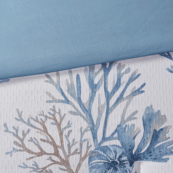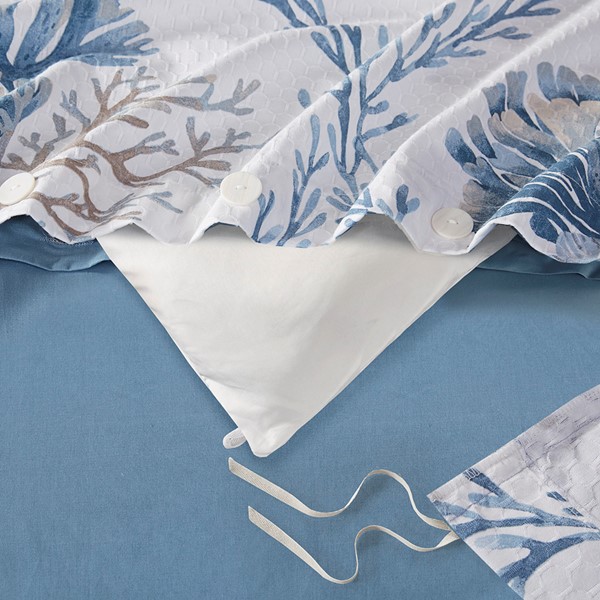 Awake in a coastal paradise with this amazing Pismo Beach duvet cover set where you will find seashells, corals, starfish, and other sea life in gorgeous hues of blue and taupe showcased against a crisp white background. The two decorative pillows comprise of a white oblong pillow with free edge design on top and a blue square pillow featuring white coral embroidery. The hypoallergenic polyester filling in the pillows contains no allergens and is treated to be dustproof.