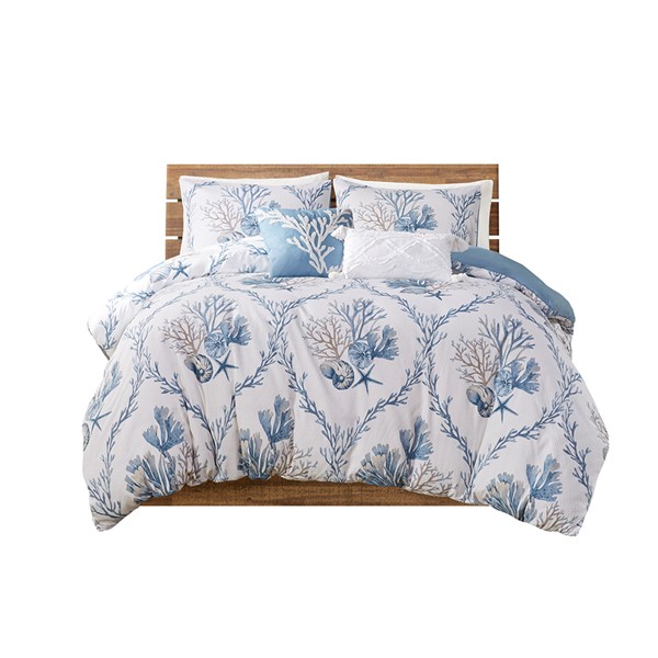 Awake in a coastal paradise with this amazing Pismo Beach duvet cover set where you will find seashells, corals, starfish, and other sea life in gorgeous hues of blue and taupe showcased against a crisp white background. The two decorative pillows comprise of a white oblong pillow with free edge design on top and a blue square pillow featuring white coral embroidery. The hypoallergenic polyester filling in the pillows contains no allergens and is treated to be dustproof.