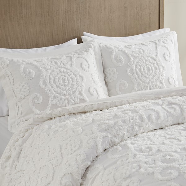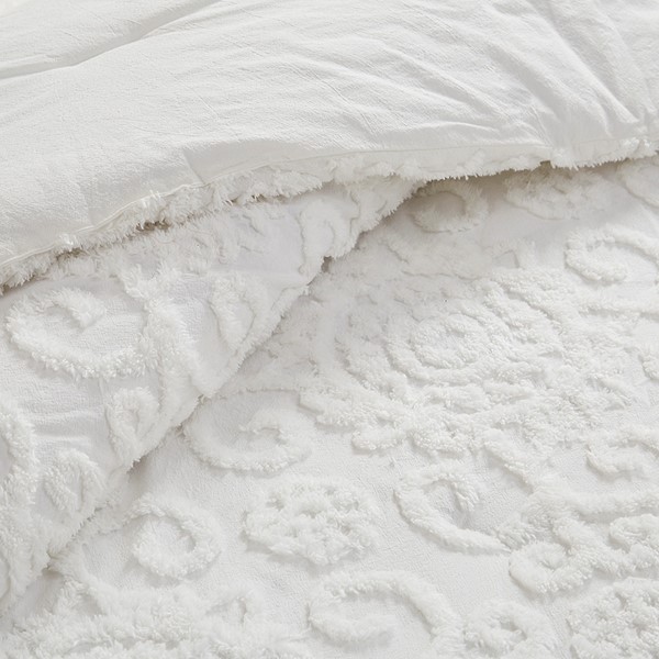 The Harbor House Suzanna Comforter Mini Set is the perfect addition to make your bedroom classically comfortable. Delicately tufted medallions are beautifully showcased throughout this comforter in a gorgeous white, giving your bedroom a soft homey feel. Matching sham(s) showcase the same beautiful technique to provide a coordinated and charming finish. Made from 100% cotton, this oversized and overfilled comforter will provide you with the utmost comfort and give you bedroom an elegant update. Complete the look with the Suzanna accessory items – coodinating decorative pillows which are sold separately. This bedding set is also OEKO-TEX certified, meaning it does not contain any harmful substances or chemicals, ensuring quality comfort and wellness. Due to the nature of the chenille fabric, some shedding will occur naturally in the first 3-4 washes. This bedding set may come in rolled or compressed packing and will need to be fluffed up. Use a steam iron to help remove wrinkles easier.