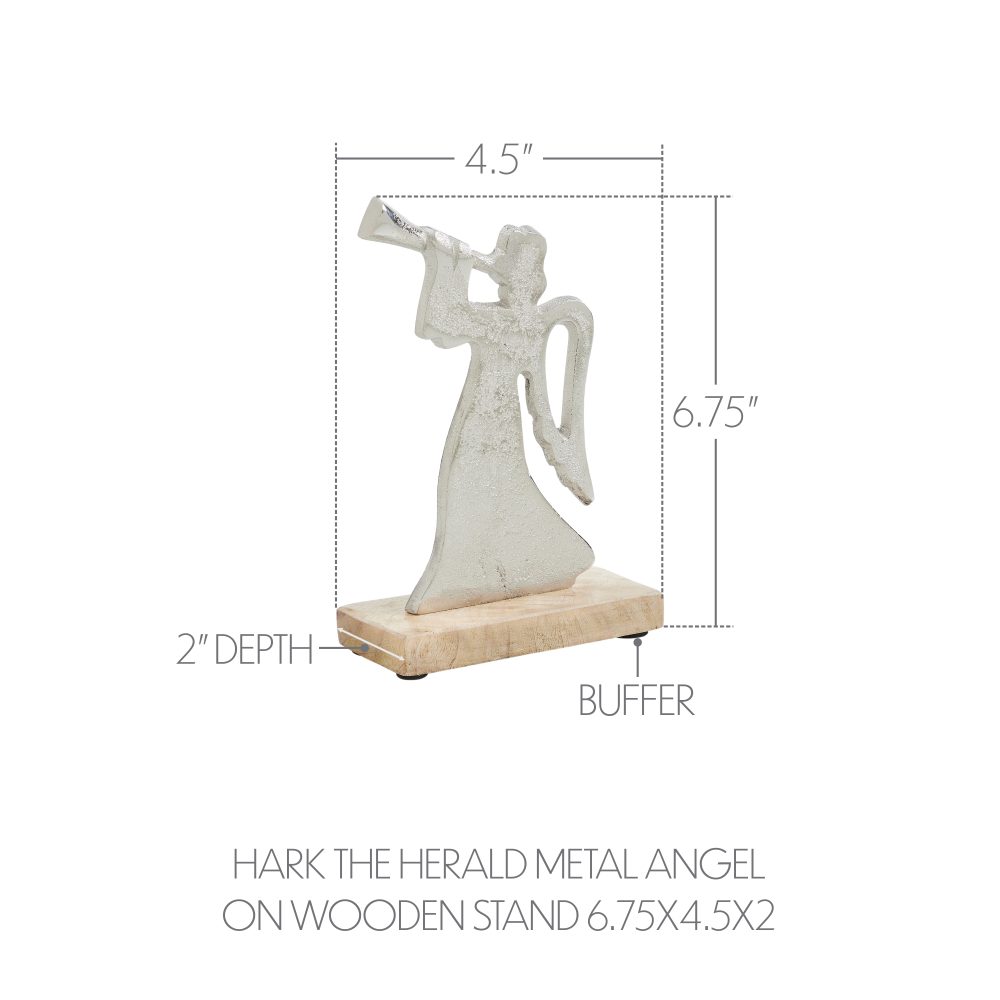 Celebrate the message of the season with the VHC Brands Hark the Herald Metal Angel on Wooden Stand, a beautifully crafted piece of Christmas and winter table decor. This 4.5x6.75 figurine features a rustic silver metal angel silhouette with folded wings, captured in mid-song as she blows her horn in joyful announcement. The textured metal has an aged, distressed finish that enhances its primitive and vintage-inspired charm. The angel is securely mounted on a light wood tan base made from tropical wood, adding a warm natural contrast to the cool metallic tones. Its minimalist yet expressive design makes it a perfect accent for farmhouse, rustic, or traditional holiday themes. Whether displayed on a mantel, shelf, dining table, or entryway console, this decorative figure brings peaceful, spiritual warmth to your seasonal setting. This versatile angel figurine fits beautifully in the bathroom, bedroom, dining room, entryway, kitchen, or living room. Painted in solid colors with a distressed appearance, it blends effortlessly into both neutral and festive palettes. To maintain its timeless look, simply wipe clean with a soft cloth. Let this charming piece be a quiet but powerful reminder of joy, hope, and heralded tidings throughout the Christmas season.
