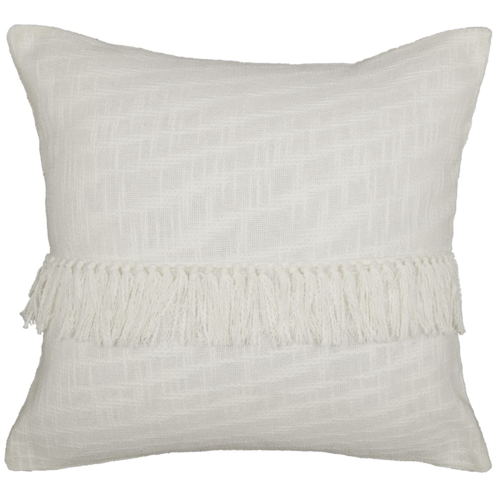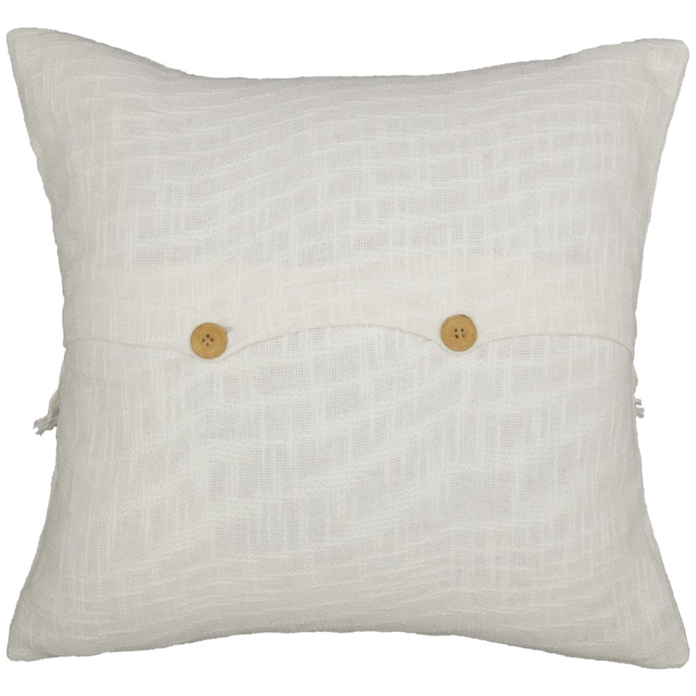 Your dream farmhouse awaits. Simply add the Harmony Pillow Cover to any setting and watch how the unique fabric brings a comfortable richness to your interiors, with thick woven yarn that features raised threads and slight knots, known as slubs. The pillow cover is richly textured, giving it a soft, cozy hand-feel, and the overall white tones have a refreshing visual depth and textural interest with the slubbed fabric. A 10 flap overlays the front of the pillow, with knotted fringes running along the bottom edge, finishing the look with a rich texture and a whimsical touch. The cover reverses to the same cotton with two natural wooden buttons for closure. There is a 3 overlap of fabric at the opening, providing more stability for the buttons plus, one extra button is hidden inside. (Just in case!) Add the pillow cover and other fabrics in the Harmony Collection to create a dreamy farmhouse.