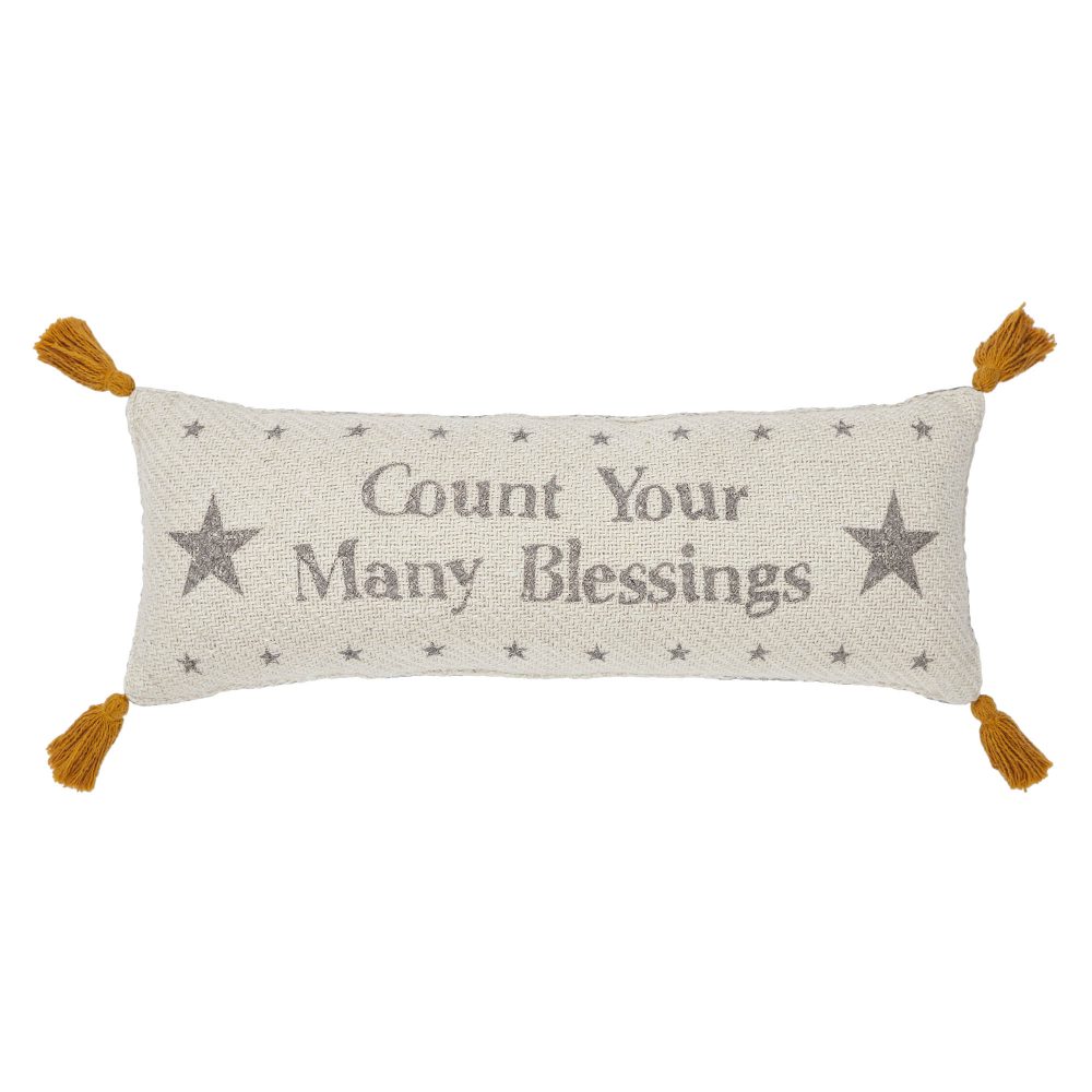 Imagine crisp autumn air drifting through an open window, sunlight filtering onto a cherished corner of your home. The VHC Brands Harvest Blessings Count Your Many Blessings Woven Pillow invites this heartwarming scene directly into your space. Crafted from a blend of enduring cotton and luxuriously soft polyester, its exquisite woven texture offers a comforting touch, instantly infusing any room with the charming rustic elegance that perfectly complements Farmhouse and Cottage Core aesthetics. The serene blend of soft creme, subtle steel grey, and inviting pumpkin orange hues paints a vivid picture of cozy fall gatherings and evokes the rich, vibrant tapestry of the harvest season. This rectangular accent pillow, measuring a thoughtful 5x15 inches, is ideally proportioned to grace an entryway bench, nestle on your favorite living room sofa, or add a heartfelt sentiment to your bedroom haven. Adorned with the deeply resonant quote, "Count Your Many Blessings," elegantly framed by a scattering of delicate stars, it serves as a beautiful daily reminder of gratitude and abundance. More than just a decorative piece, this VHC Brands creation brings a palpable sense of warmth and inviting spirit, fostering moments of quiet reflection amidst the bustle of the season. Designed for lasting beauty, simply spot clean to maintain its rich colors and intricate details, allowing its country-inspired charm to bless your home throughout the autumn and Thanksgiving festivities.