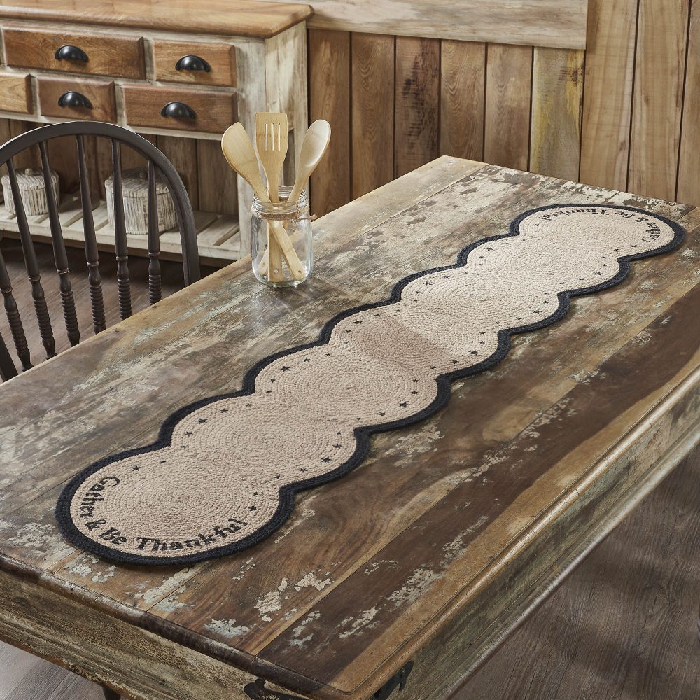 - PREMIUM QUALITY & DESIGN: Elevate your dining experience with the VHC Brands 12×60 Harvest Blessings Stenciled Table Runner, masterfully constructed from a substantial blend of tactile braided cotton and smooth cotton polyester, featuring a deeply meaningful “Gather & Be Thankful” stencil alongside charming country stars, presented in a comforting light khaki and raven black color palette to effortlessly infuse your space with farmhouse-inspired charm and the heartfelt spirit of autumn and Thanksgiving gatherings, while offering convenient hand-washable care for lasting beauty.
