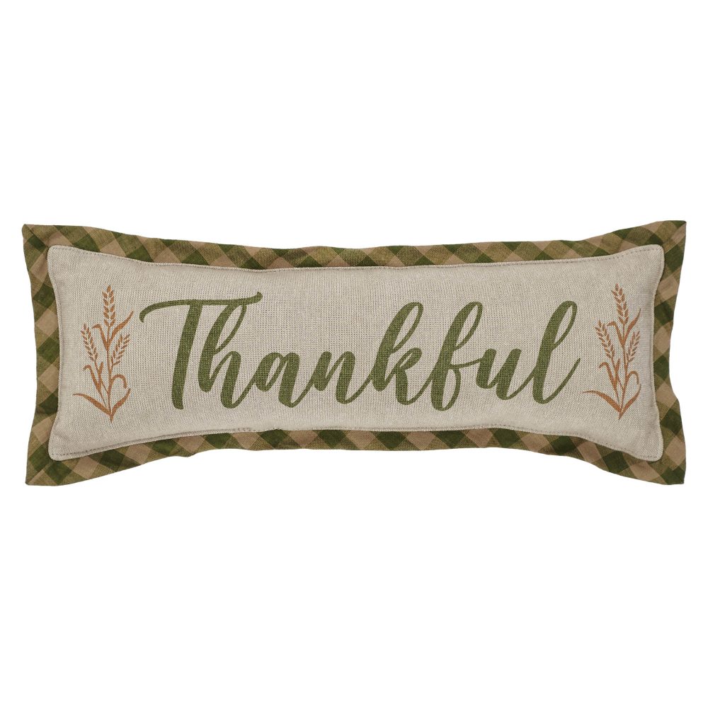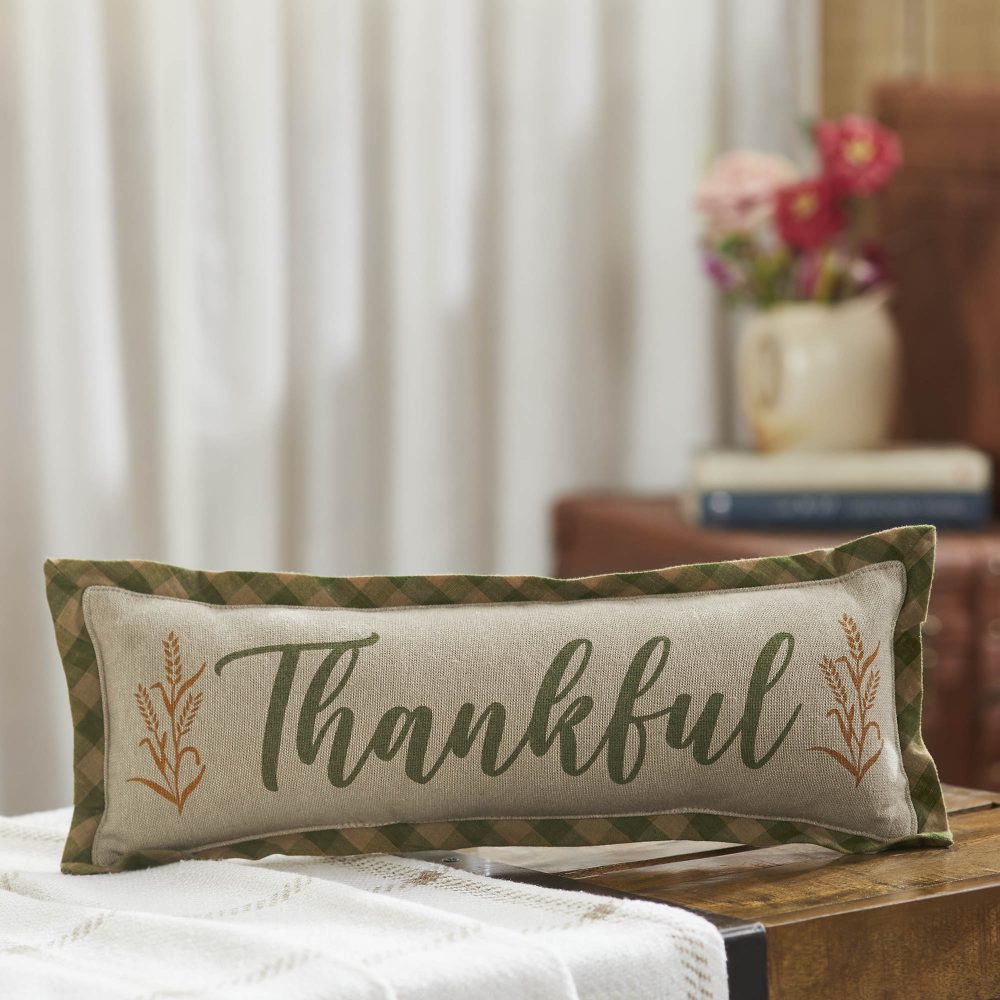 Embrace the heartwarming essence of autumn with the VHC Brands Harvest Blessings Thankful Pillow. Crafted from pure, invitingly soft cotton, its comforting texture beckons you to settle in, offering a durable yet gentle touch ideal for any farmhouse or cottage-inspired sanctuary. This charming 5x15 inch rectangular throw pillow effortlessly infuses rustic elegance into your space. The artistry of nature unfolds on its surface, where the gentle curve of wheat stalks frames a beautifully printed "Give Thanks" quote, inviting quiet reflection. Drenched in the earthy tones of natural, deep olive green, and warm mustard yellow, this pillow radiates the very soul of fall, creating a cozy, inviting visual tapestry perfect for your entryway bench, living room sofa, or a tranquil bed nook. More than just a decorative accent, this Harvest Blessings Thankful Pillow cultivates an atmosphere of warmth and gratitude throughout your home. Picture it nestled amongst braided throws and natural wood accents, a beacon of country-inspired charm in your living room, or a sweet whisper of autumn on your bedroom set. It's the perfect companion for snuggling up with loved ones on crisp evenings or welcoming cherished guests during Thanksgiving gatherings, silently celebrating the season's abundant blessings. Designed for effortless enjoyment, its spot-clean only care ensures the intricate printed detail and vibrant fall colors remain crisp and beautiful, season after season, making this delightful pillow a timeless expression of thankfulness in your cherished abode.