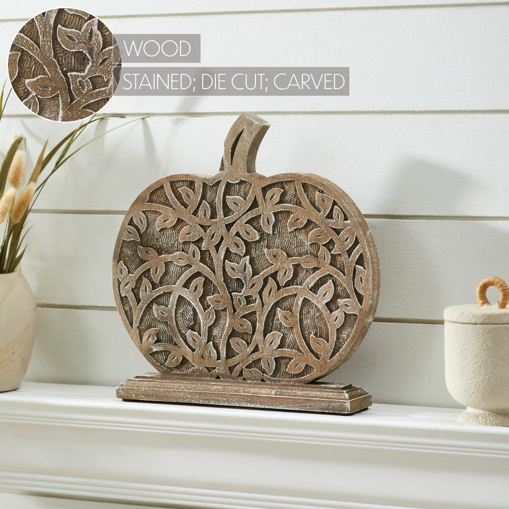 Imagine the gentle glow of autumn light catching the intricate details of the VHC Brands Harvest Vine Carved Wooden Pumpkin. Each carefully carved vine gracefully weaves across its surface, creating a captivating display of natural, earthy charm that feels plucked directly from a rustic garden. The tender blend of tan and white, subtly distressed, whispers tales of cherished heirlooms and timeless farmhouse comforts, bringing a vintage-inspired embrace to your seasonal sanctuary. Crafted from resilient tropical wood, this exquisite 11x12 inch pumpkin sits with quiet confidence on its secure base, ready to anchor your mantel or grace a sunlit shelf with its serene presence. Beyond its charming aesthetic, this VHC Brands pumpkin effortlessly transforms any corner into a cozy cottage retreat. Its carved floral whispers add an elegant touch to the rustic design, making it the quintessential piece for your farmhouse, country, or primitive-style interiors. Place it on your dining room table for a harvest feast, let it welcome guests from your entryway console, or simply enjoy its warming character on a living room shelf. Whether nestled among other autumn treasures or standing as a singular statement in your bathroom, bedroom, or kitchen, this delightful wooden pumpkin infuses your home with a welcoming, festive spirit and the comforting embrace of fall, all season long.