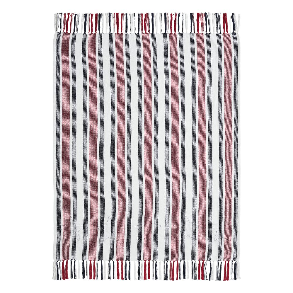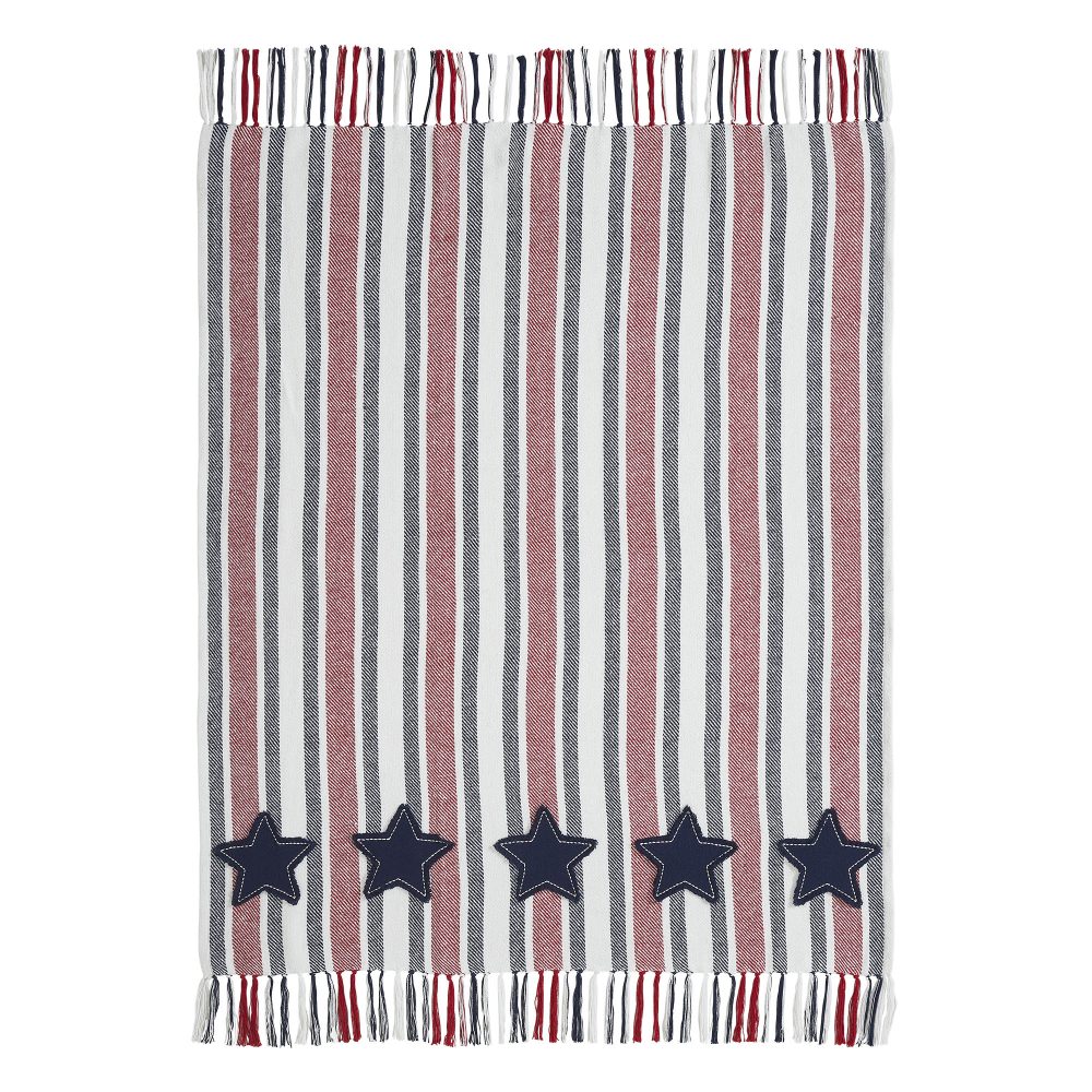 Wrap yourself in patriotic charm with the VHC Brands Patriotic Hatteras Stars Woven Throw Blanket 50x60. This cozy and stylish throw features a classic Americana design with navy, red, and creme stripes accented by appliqued navy stars along the bottom edge. The stars are trimmed with intricate rice stitching, adding a touch of handcrafted elegance. Knotted tassels on each end and an unfinished edge complete the look, giving this blanket a rustic yet refined appeal. Perfect for adding warmth and character to any space, this versatile throw is ideal for bedrooms, living rooms, entryways, or even kitchen seating areas. Its timeless stars-and-stripes pattern complements rustic farmhouse and country-style interiors, making it an excellent choice for Independence Day decor or everyday use. Drape it over your couch, armchair, or bed to instantly elevate your home with patriotic pride and cozy charm. Made from a durable cotton-polyester blend, the VHC Brands Patriotic Hatteras Stars Woven Throw Blanket is as practical as it is stylish. It's machine washable for easy care, ensuring it remains soft and vibrant even with frequent use. Whether you're curling up with a good book or hosting a festive gathering, this throw combines quality craftsmanship and classic design to bring comfort and Americana flair to your home.