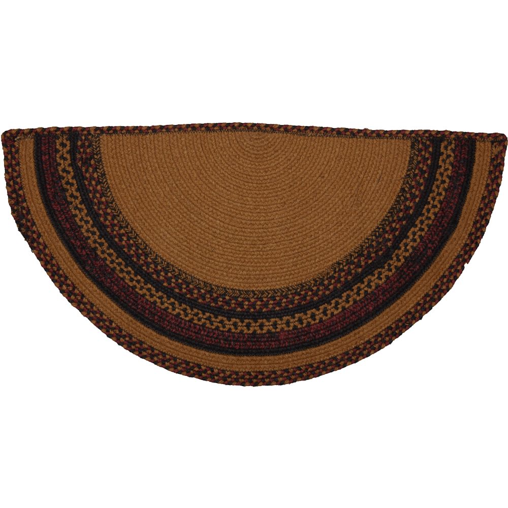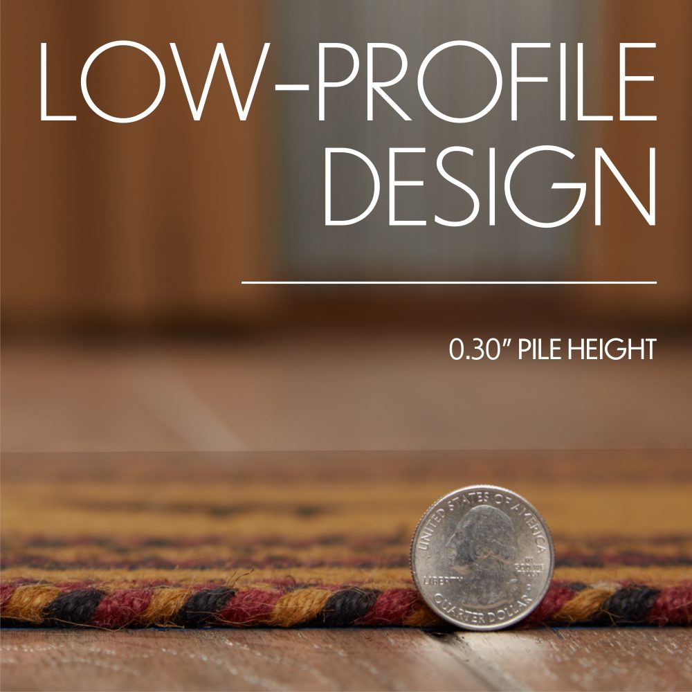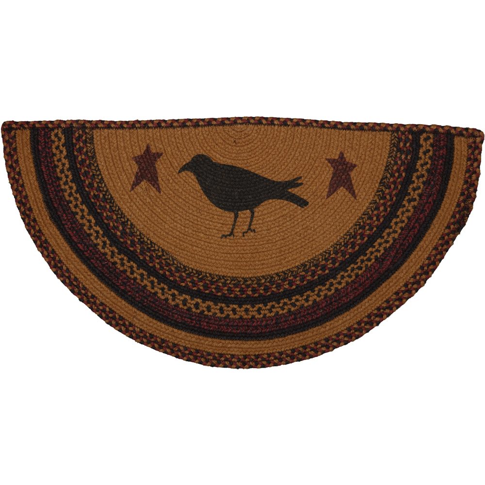 Create a warm, homey feeling with deep primitive colors in a curl-resistant jute blend that adds style and safety anywhere a small accent rug is needed. The Heritage Farms Crow Jute Rug measures 16.5x33 inches and features a classic half circle shape and tight braids constructed with a durable jute blend. The special blend relaxes faster and stays flat. The unique shape allows for a perfect fit in doorways and in front of a kitchen sink. Features a blend of mustard tan, raven black and burgundy with primitive-style stenciling of a crow and two stars for a dark, rustic look that complements a wide array of country farmhouse decor.