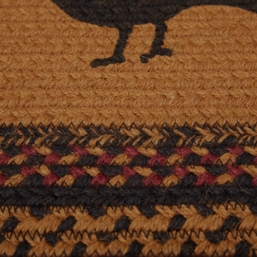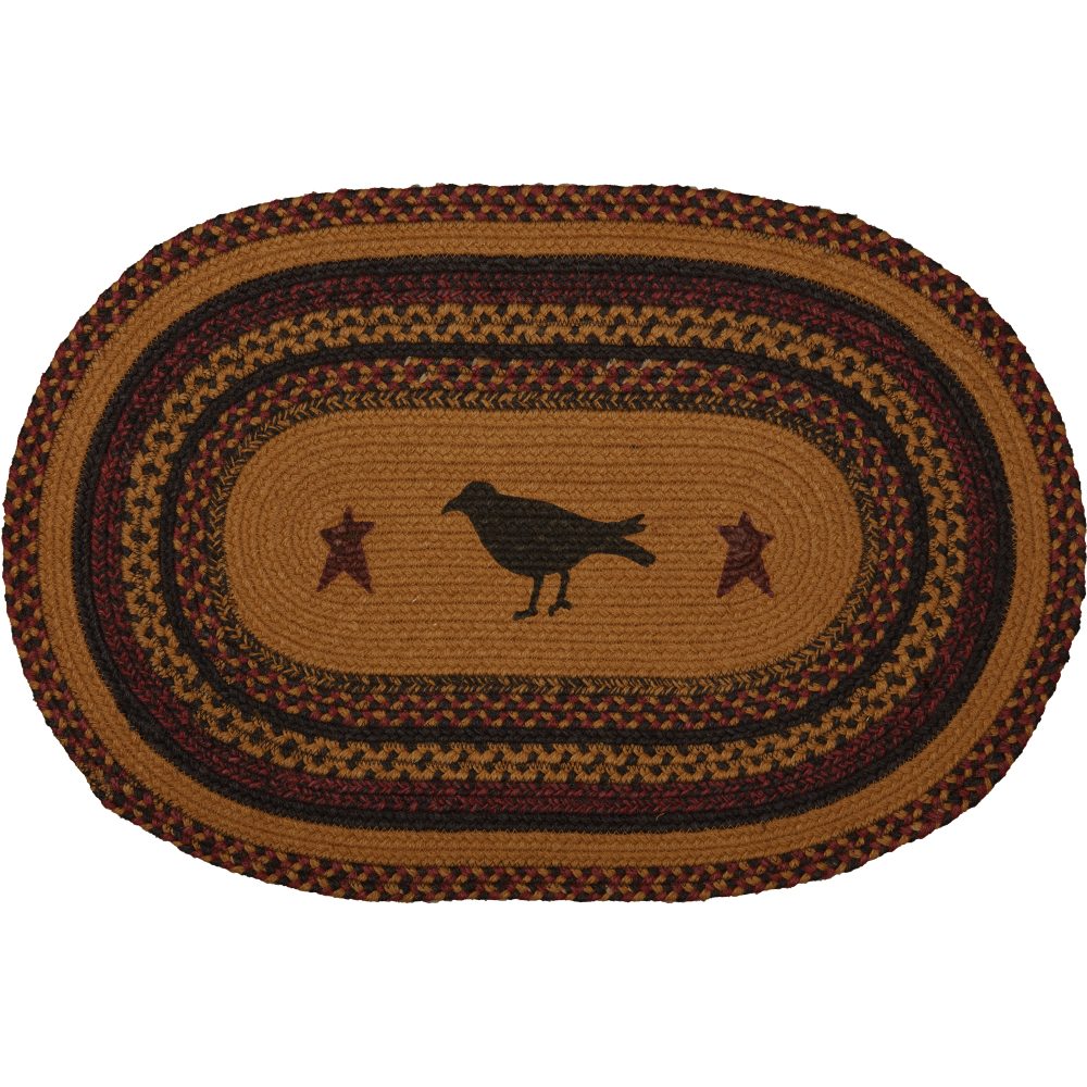 Create a warm, homey feeling with deep primitive colors in a curl-resistant jute blend that adds style and safety anywhere a small accent rug is needed. The Heritage Farms Crow Jute Rug measures 20x30 inches and features a classic oval shape and tight braids constructed with a durable jute blend. The special blend relaxes faster and stays flat. Features a blend of mustard tan, raven black and burgundy with primitive-style stenciling of a crow and two stars for a dark, rustic look that complements a wide array of country farmhouse decor.