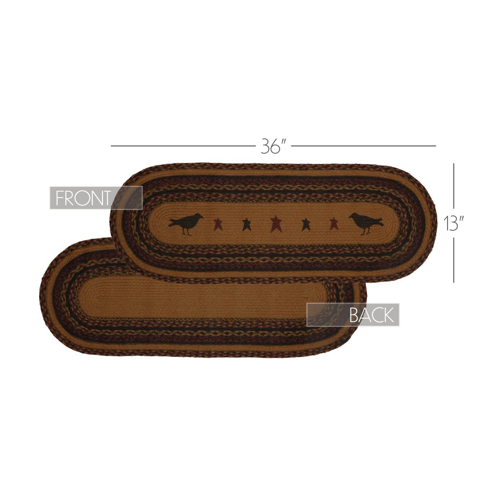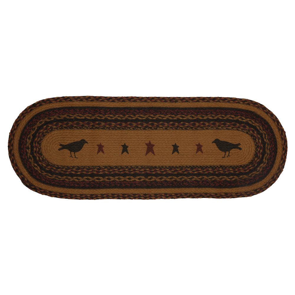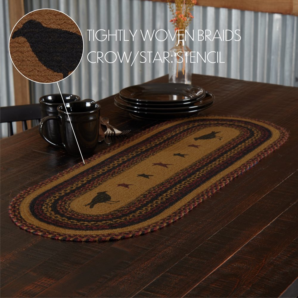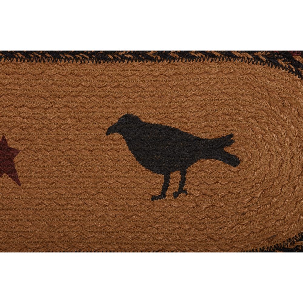 Create a joyful table for friends and family to gather round with robust colors and classic texture. The Heritage Farms Crow Jute Runner includes one table runner measuring 13x36 inches made from a premium Jute blend. The rich texture of braided jute is given a warm, rustic look with mustard tan, raven black and burgundy tones and folk art style stars surrounded by two black crows for bold country style. Complete your tabletop decor with other pieces from the Heritage Farms Jute Collection by VHC for primitive farmhouse style.
