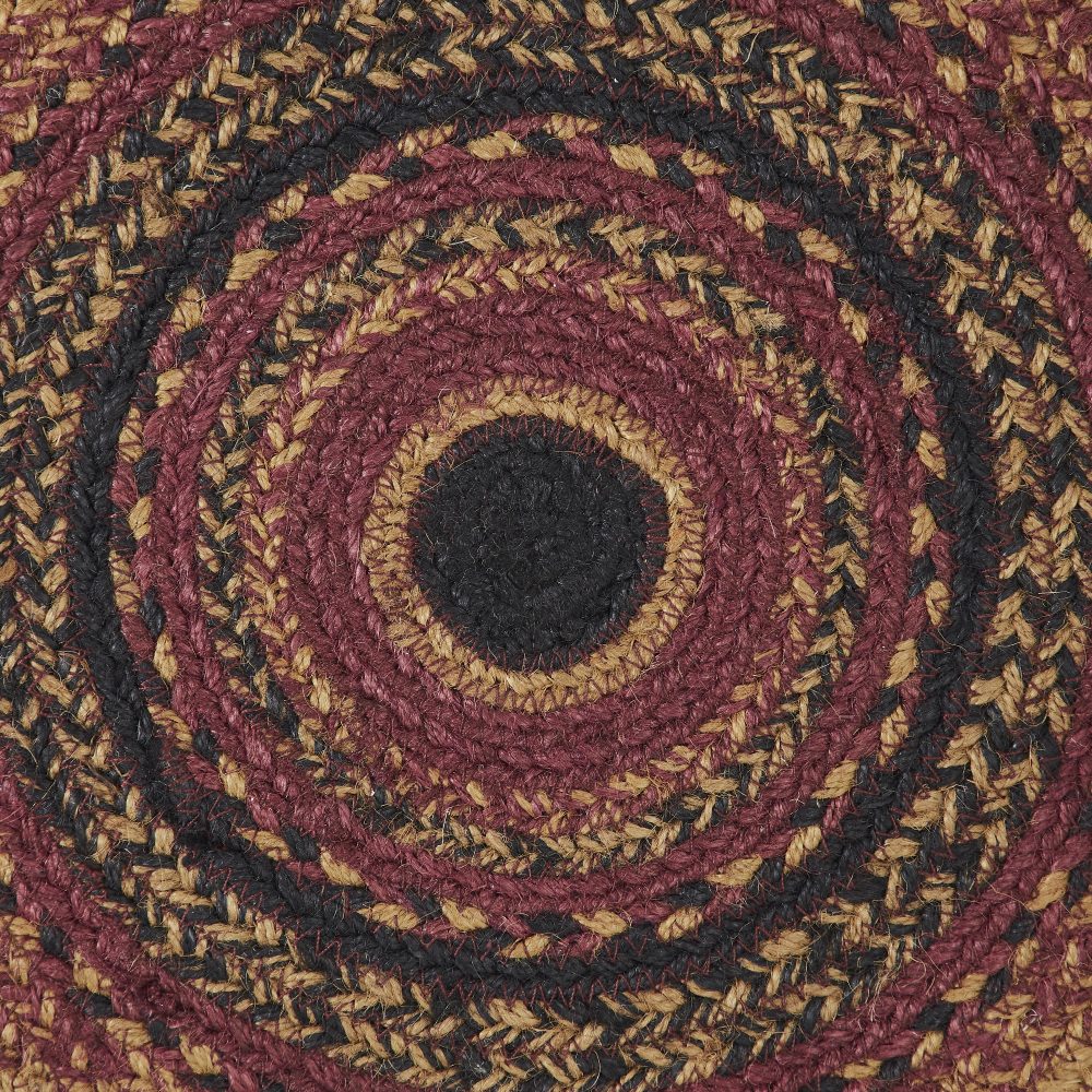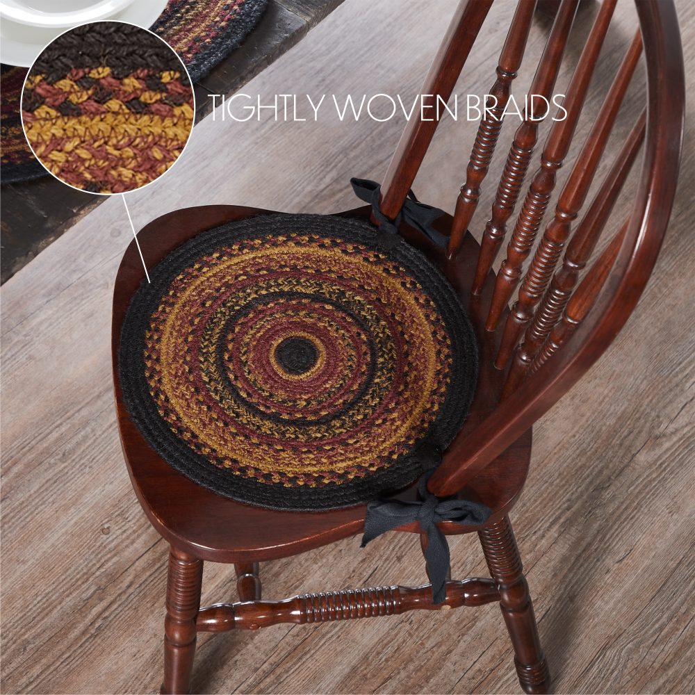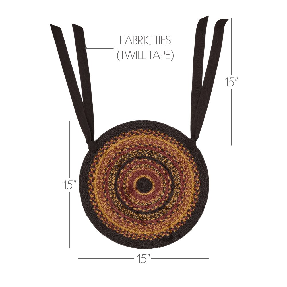Add charming classic country style to your table with warm, mustard tan jute with black and burgundy accents. The Heritage Farms Jute Chair Pad is a durable 15-inch round chair cushion with long ties to easily add a pop of primitive country charm to a wide variety of seating. This low-profile farmhouse seat pad features a durable jute blend for long-lasting style while offering your chairs protection from damage. Spot clean as needed. To give your kitchen or tabletop a complete traditional country look, pair with other items from the Heritage Farms Collection including placemats, table runners and more.