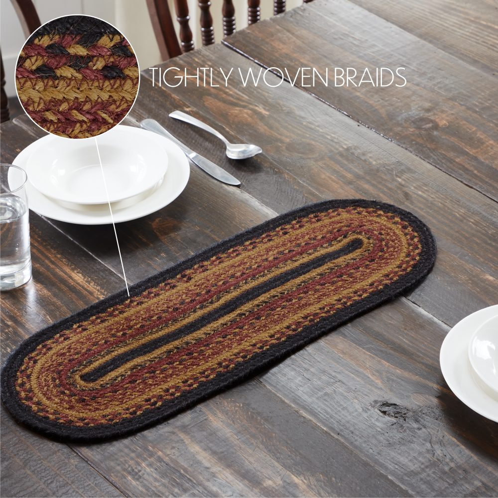 Create a joyful table for friends and family to gather round with robust colors and classic texture. The Heritage Farms Jute Runner includes an individual table runner measuring 8x24 inches made from a premium Jute blend. The rich texture of braided jute is given a warm, rustic look with mustard tan, raven black and burgundy tones for bold country style. Complete your tabletop decor with other pieces from the Heritage Farms Jute Collection by VHC for primitive farmhouse style.