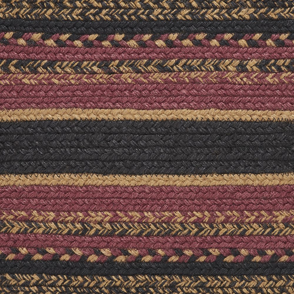 Create a warm, homey feeling with deep primitive colors in a curl-resistant jute blend that adds style and safety anywhere a large accent rug is needed. The Heritage Farms Jute Rug measures 36x60 inches and features a classic oval shape and tight braids constructed with a durable jute blend. The special blend relaxes faster and stays flat. The included PVC mat makes sure your beautifully braided jute rug stays exactly where it should. Features a blend of mustard tan, raven black and burgundy for a dark, rustic look that complements a wide array of country farmhouse decor.