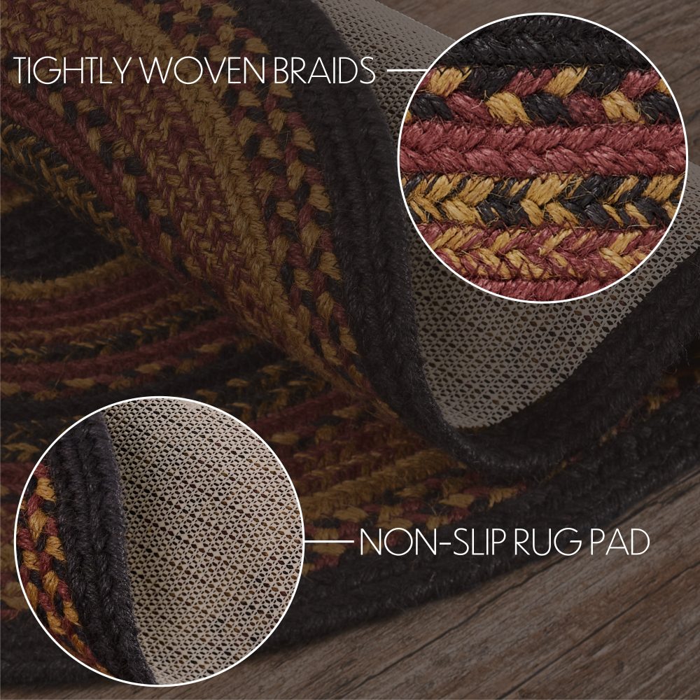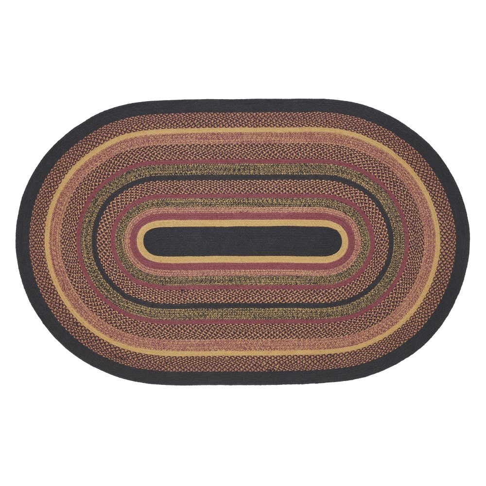Create a warm, homey feeling with deep primitive colors in a curl-resistant jute blend that adds style and safety anywhere a versatile area rug is needed. The Heritage Farms Jute Rug measures 60x96 inches and features a classic oval shape and tight braids constructed with a durable jute blend. The special blend relaxes faster and stays flat. The included PVC mat makes sure your beautifully braided jute rug stays exactly where it should. Features a blend of mustard tan, raven black and burgundy for a dark, rustic look that complements a wide array of country farmhouse decor.