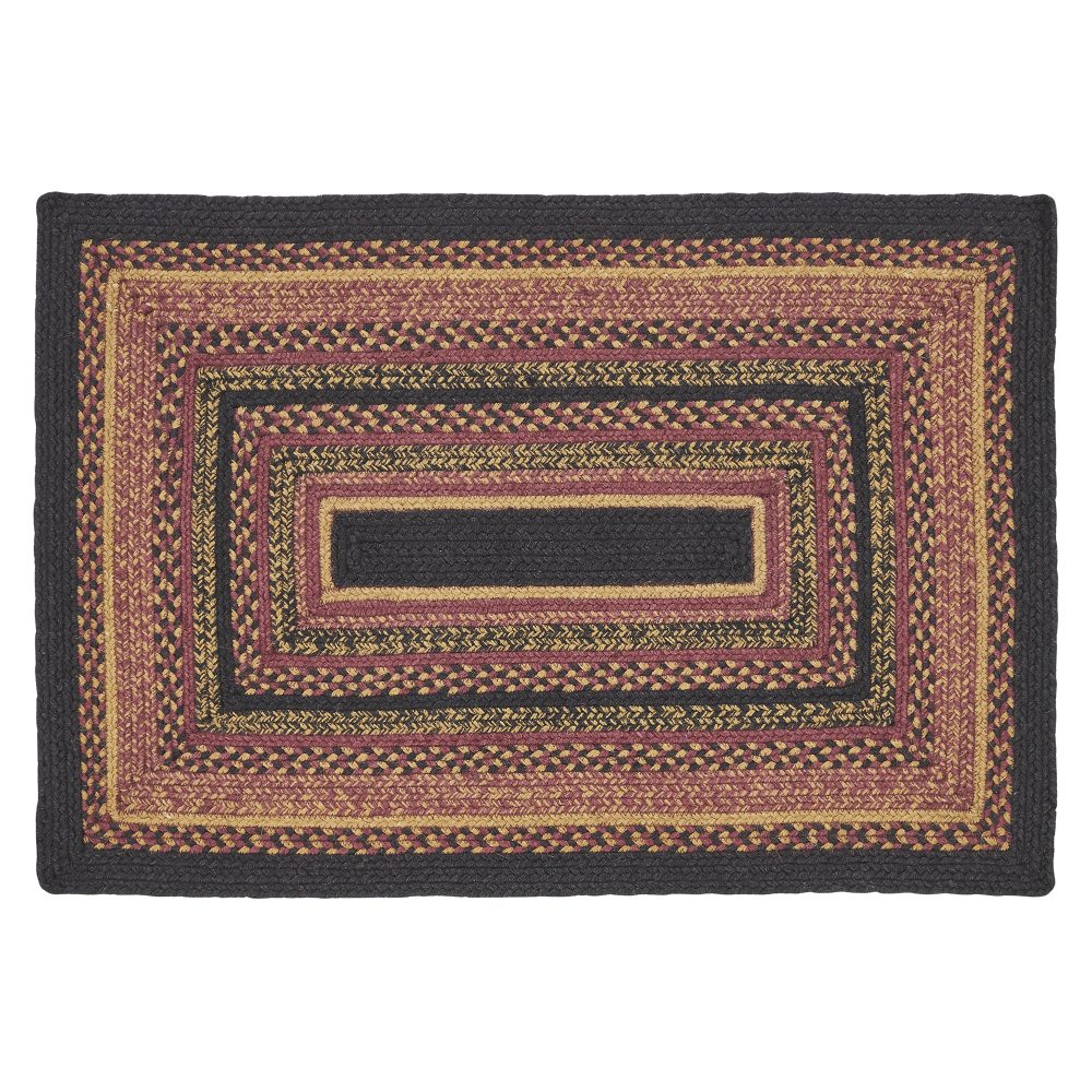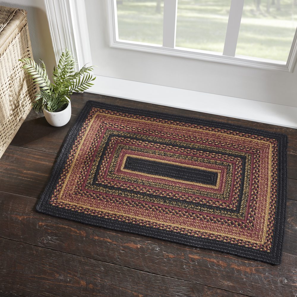 Create a warm, homey feeling with deep primitive colors in a curl-resistant jute blend that adds style and safety anywhere a mid-size accent rug is needed. The Heritage Farms Jute Rug measures 24x36 inches and features a classic rectangle shape and tight braids constructed with a durable jute blend. The special blend relaxes faster and stays flat. Features a blend of mustard tan, raven black and burgundy for a dark, rustic look that complements a wide array of country farmhouse decor.