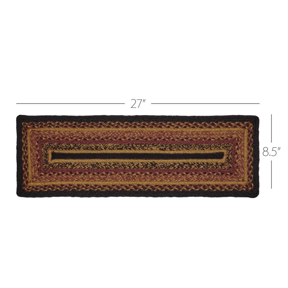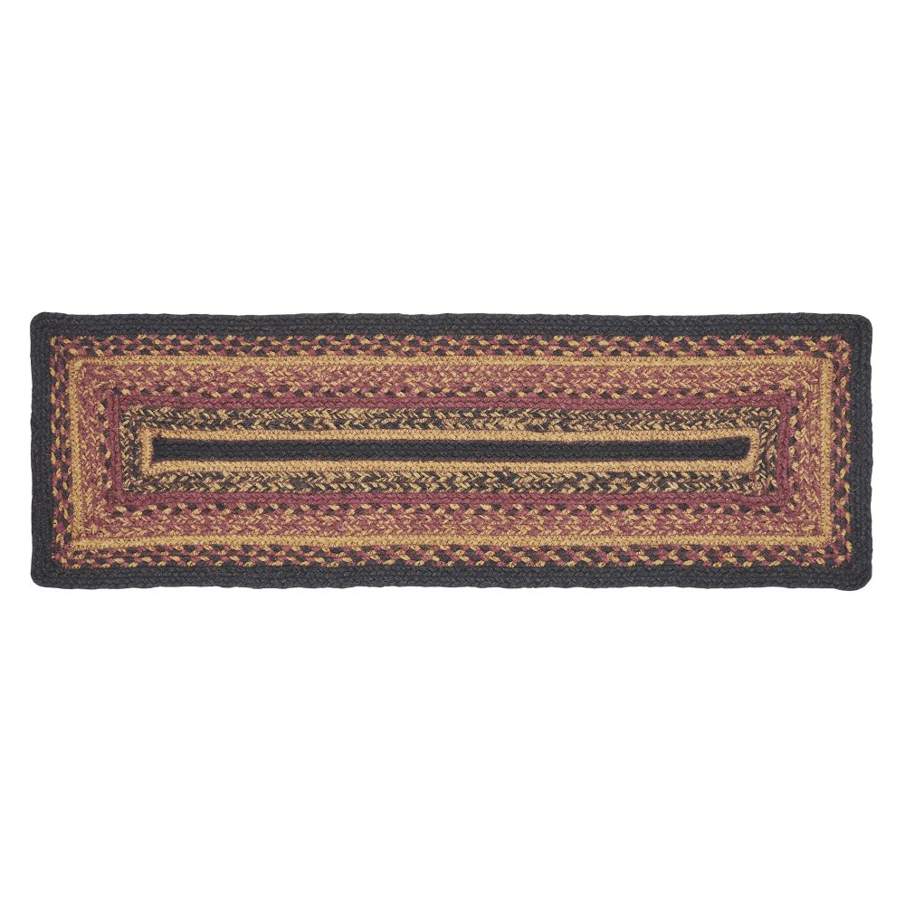 Protect stairways from damage and add style with braided jute in warm, traditional tones. The Heritage Farms Jute Stair Tread Rectangle includes one 8.5x27 inch stair tread back by a latex spray to help prevent slipping. The low-profile jute features an innovative blend of 80 percent Jute and 20 percent cotton and other fibers to help the tread lay flat and resist creasing. This rectangle-shaped tread features a blend of mustard tan, raven black and burgundy braids for a warm, primitive look. Coordinates with the Heritage Farms Collection by VHC for a complete primitive farmhouse set featuring rugs, kitchen accessories and more.