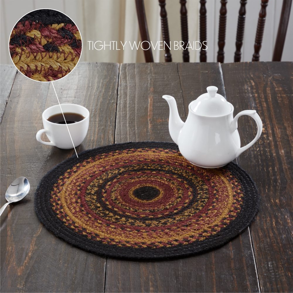 Who says trivets have to be boring? Protect counters and tables from hot pans and dishes with traditional color and classic texture. The Heritage Farms Jute Trivet includes one circular trivet with a 15-inch diameter made from a premium Jute blend. The rich texture of braided jute is given a warm, primitive feel with alternating rows of black, burgundy and mustard tan. Complete your tabletop decor with other pieces from the Heritage Collection by VHC for modern primitive country style.
