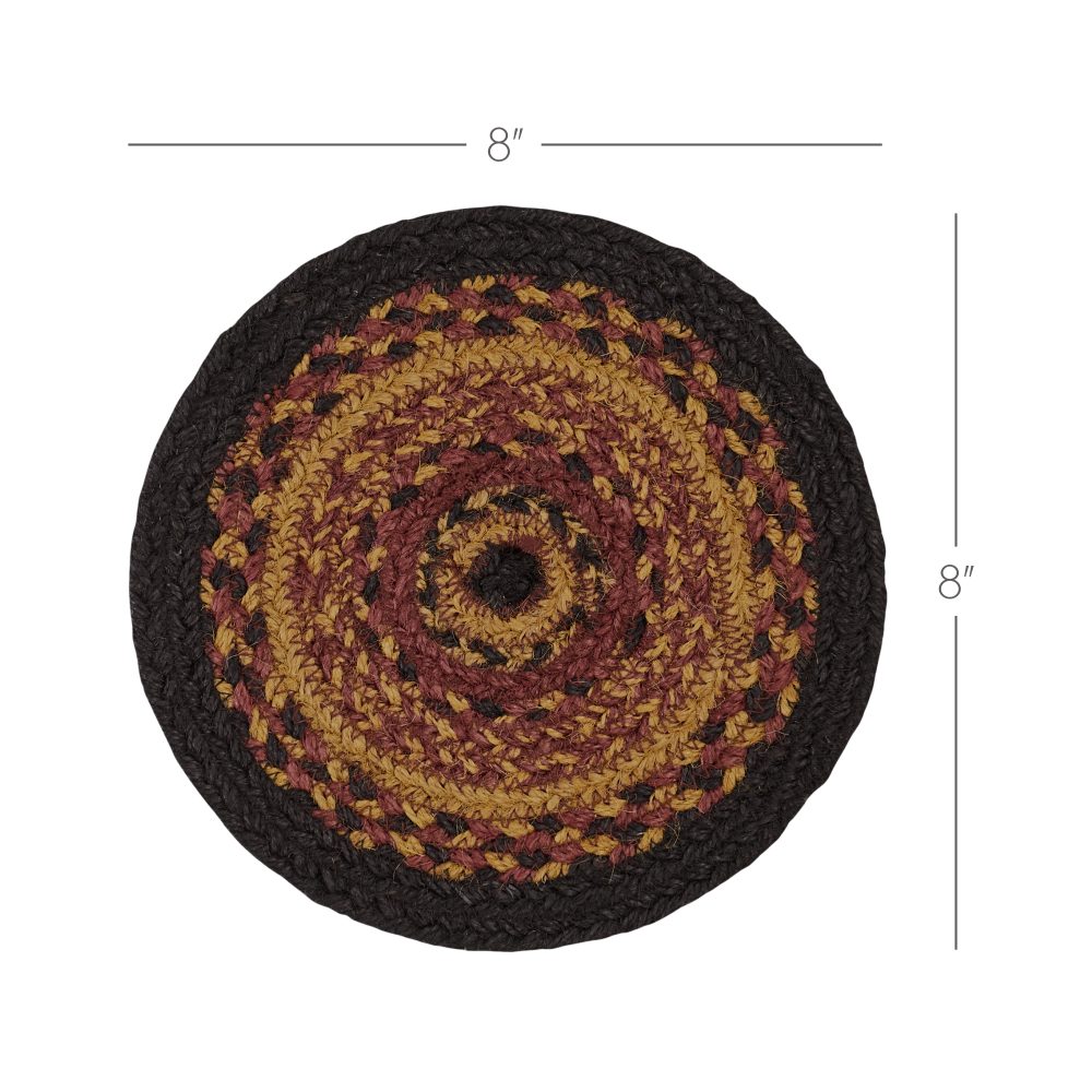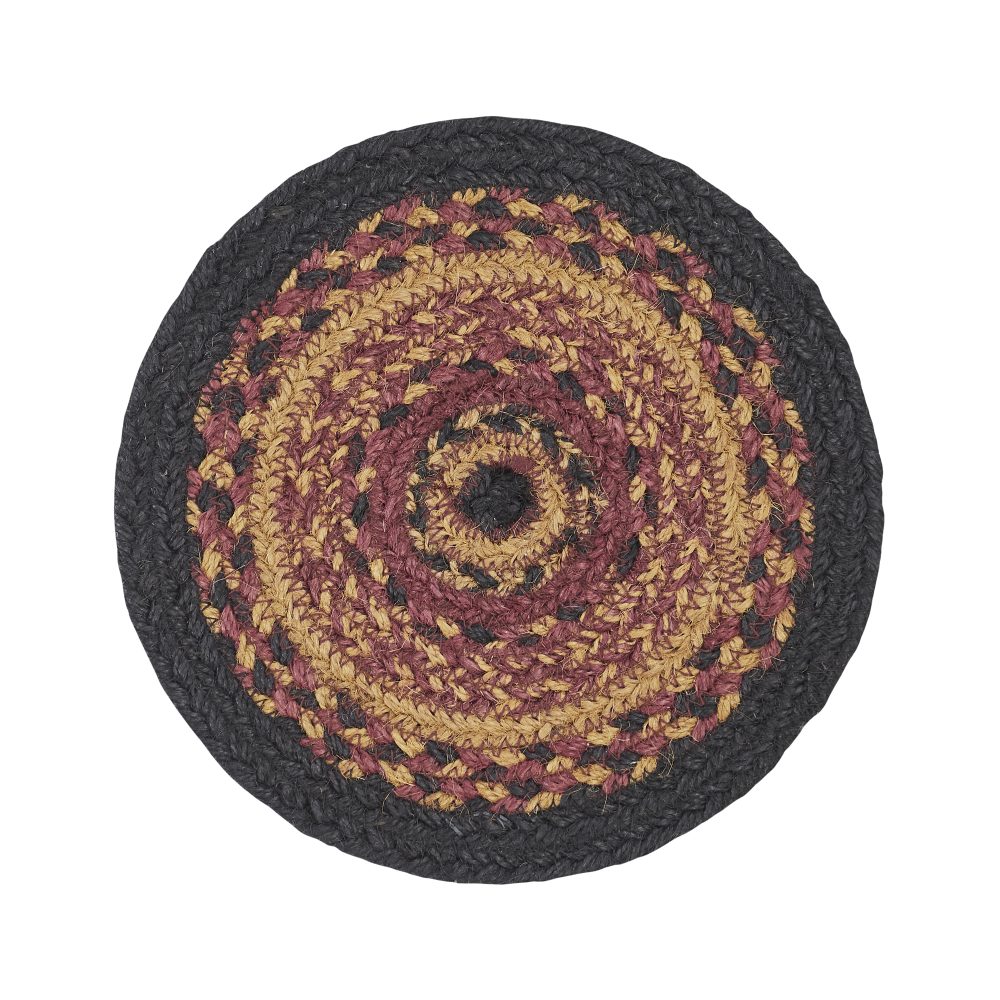 Who says trivets have to be boring? Protect counters and tables from hot pans and dishes with traditional color and classic texture. The Heritage Farms Jute Trivet includes one circular trivet with an 8-inch diameter made from a premium Jute blend. The rich texture of braided jute is given a warm, primitive feel with alternating rows of black, burgundy and mustard tan. Complete your tabletop decor with other pieces from the Heritage Collection by VHC for modern primitive country style.