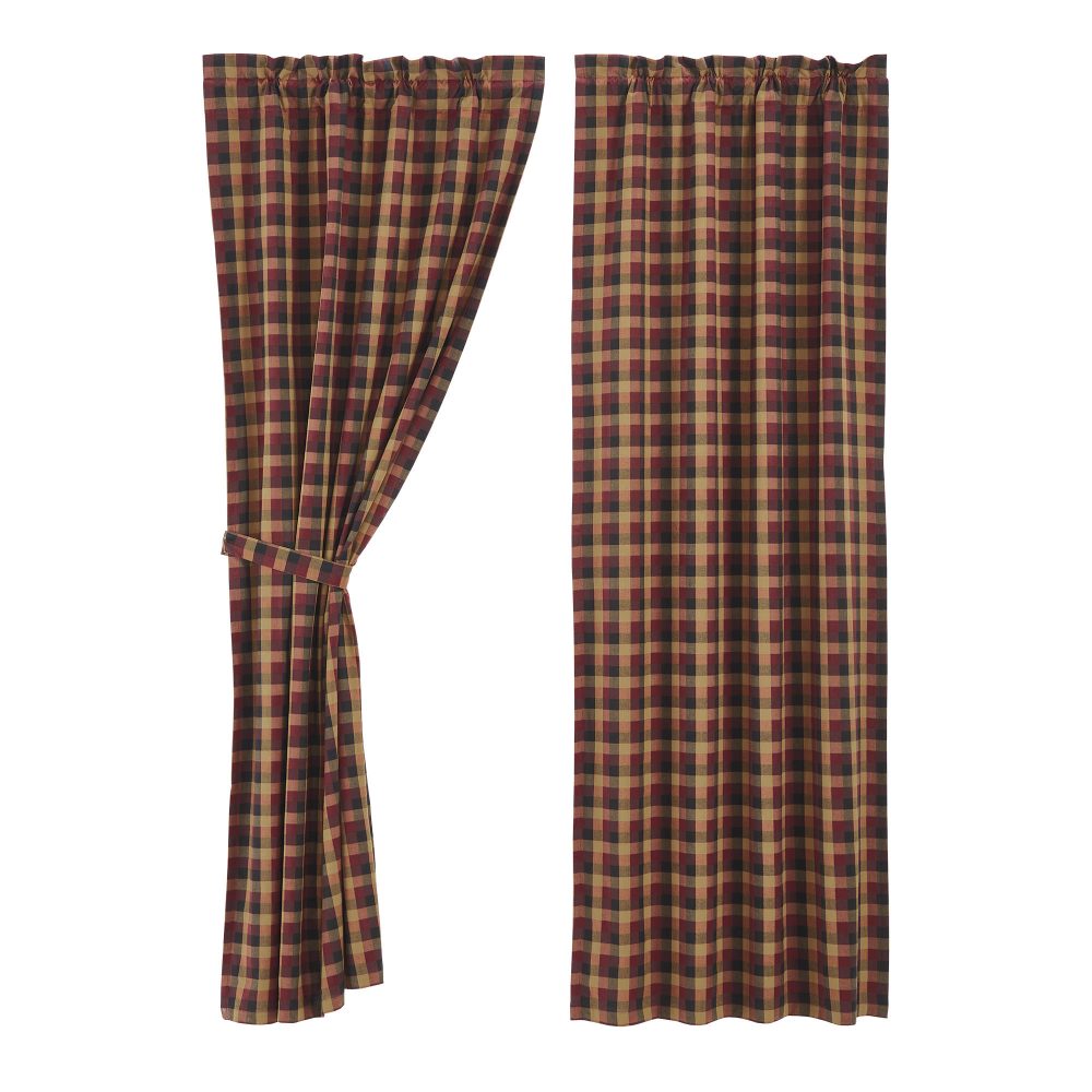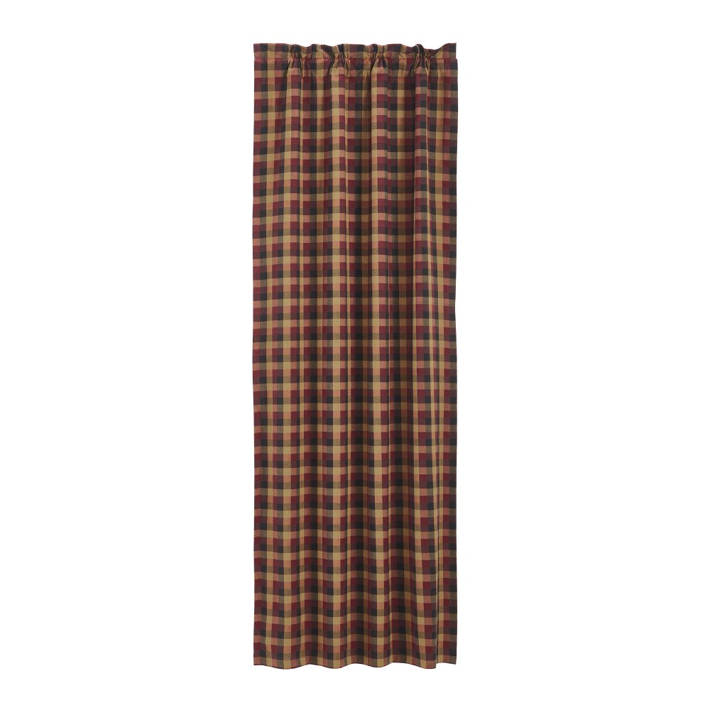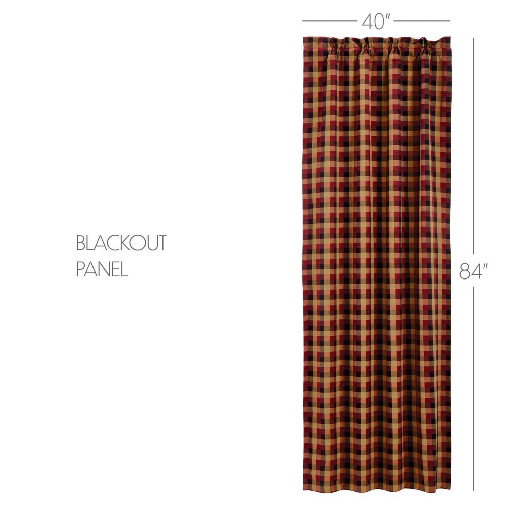 Bold plaid in rustic tones of burgundy, mustard yellow and black create the perfect accent to your modern primitive window decor. The Heritage Farms Blackout Panel includes a single 84x40 inch cotton window panel with a matching tie back. The room darkening panel includes a blackout lining crafted from 100 percent polyester to add practical benefits without sacrificing style. The panel is easy to hang with a generous 3.25 inch rod pocket with a 2 inch header. Machine washable and iron safe.